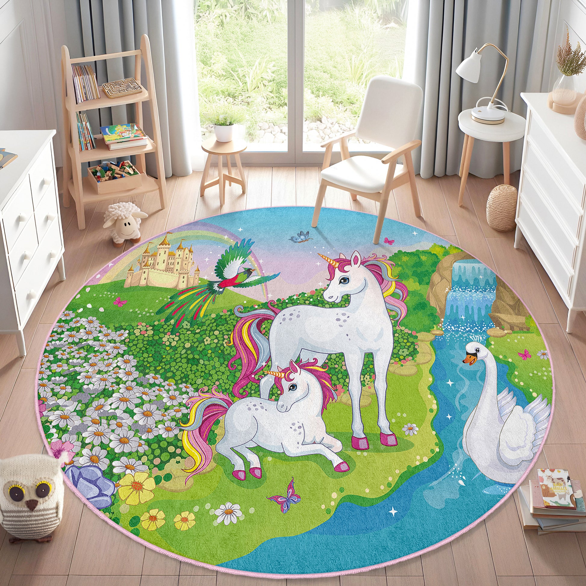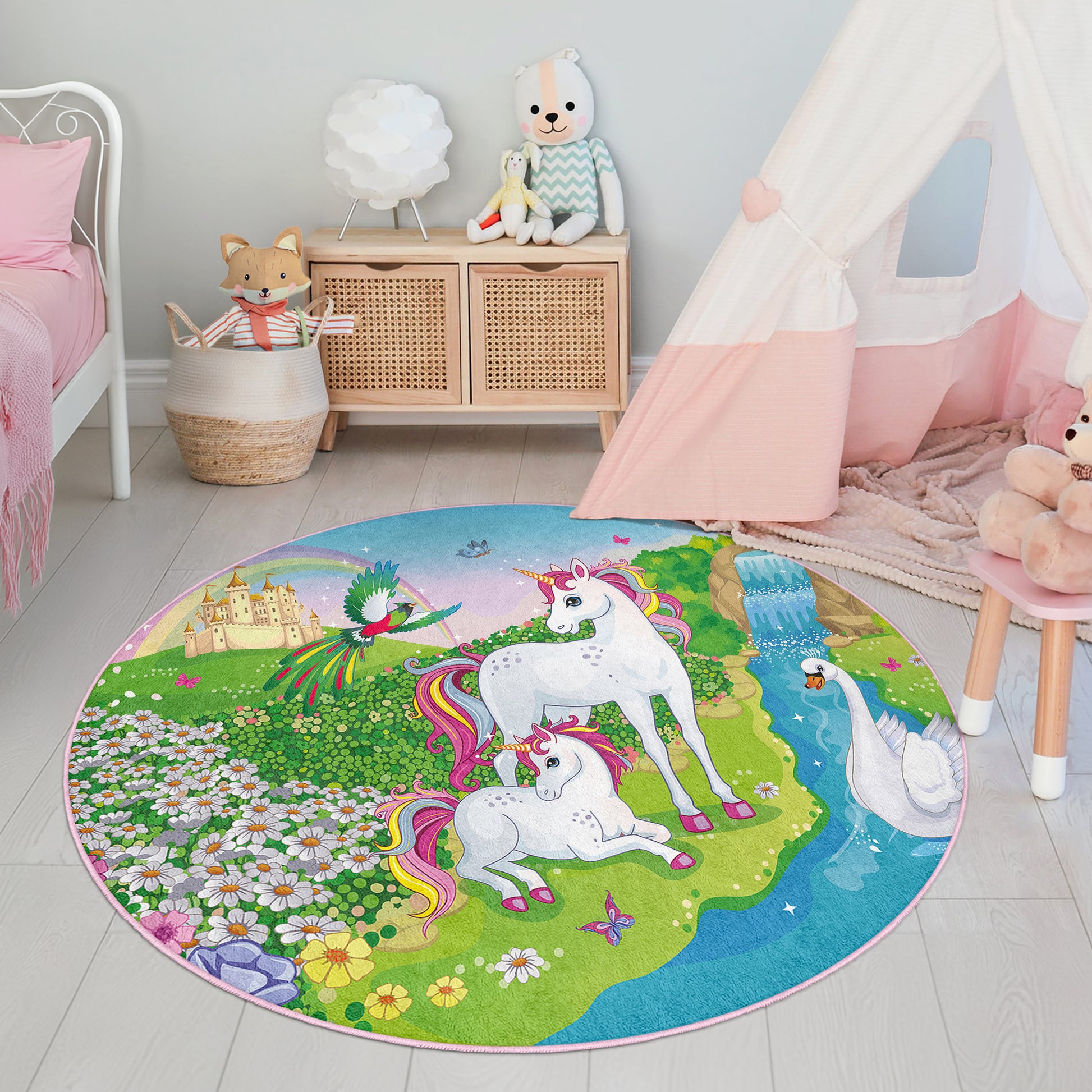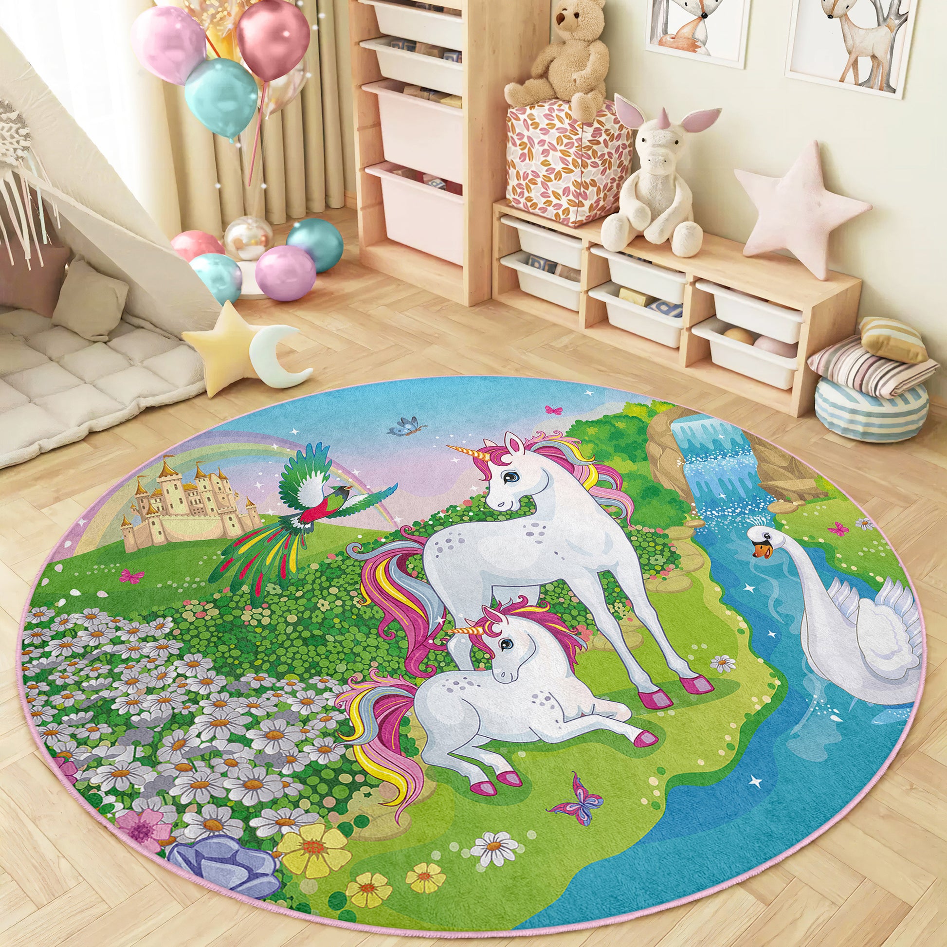 Two Horses Like Ponny and with a Swan in Beatiful Nature Design Washable Anti-Slip Kids Round Rug Multifunction as Non Slip Play Mat - Perfect for Bedrooms, Playrooms & Nurseries - Durable, Safe, & Easy to Clean for Boys & Girls Room 333