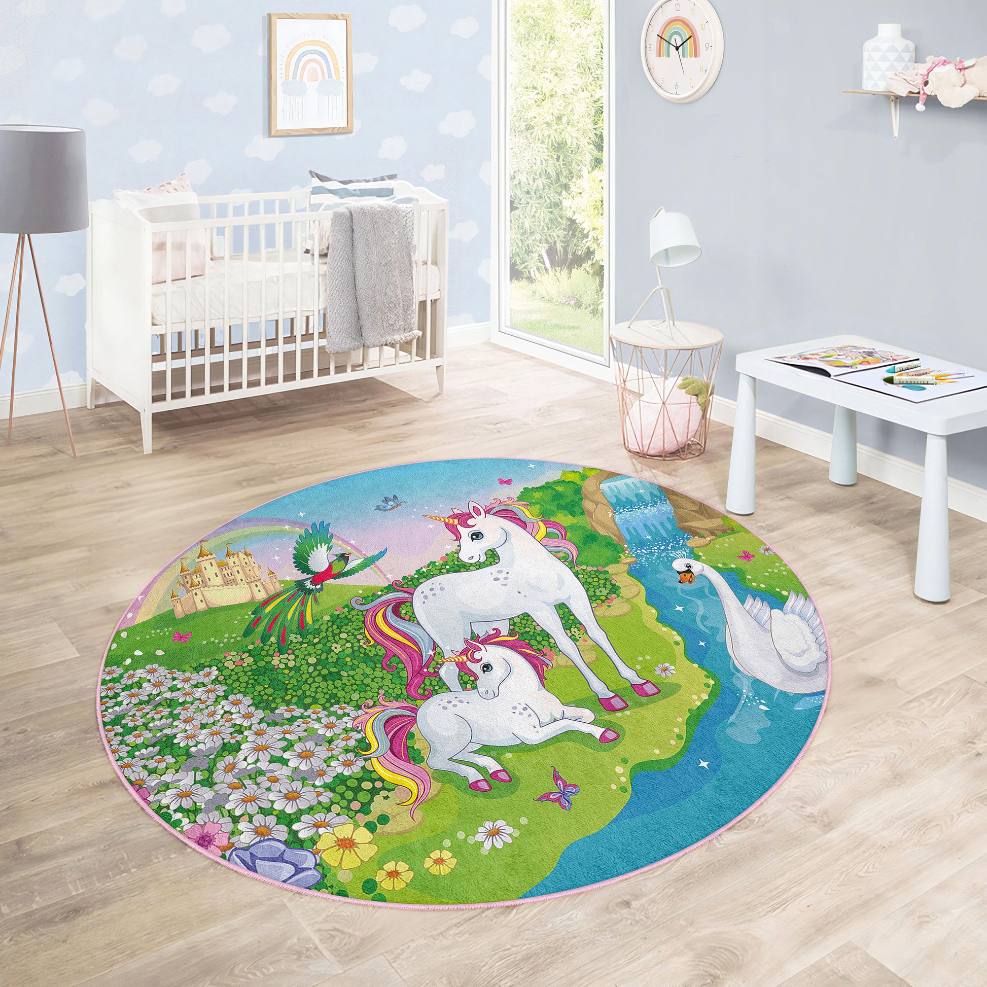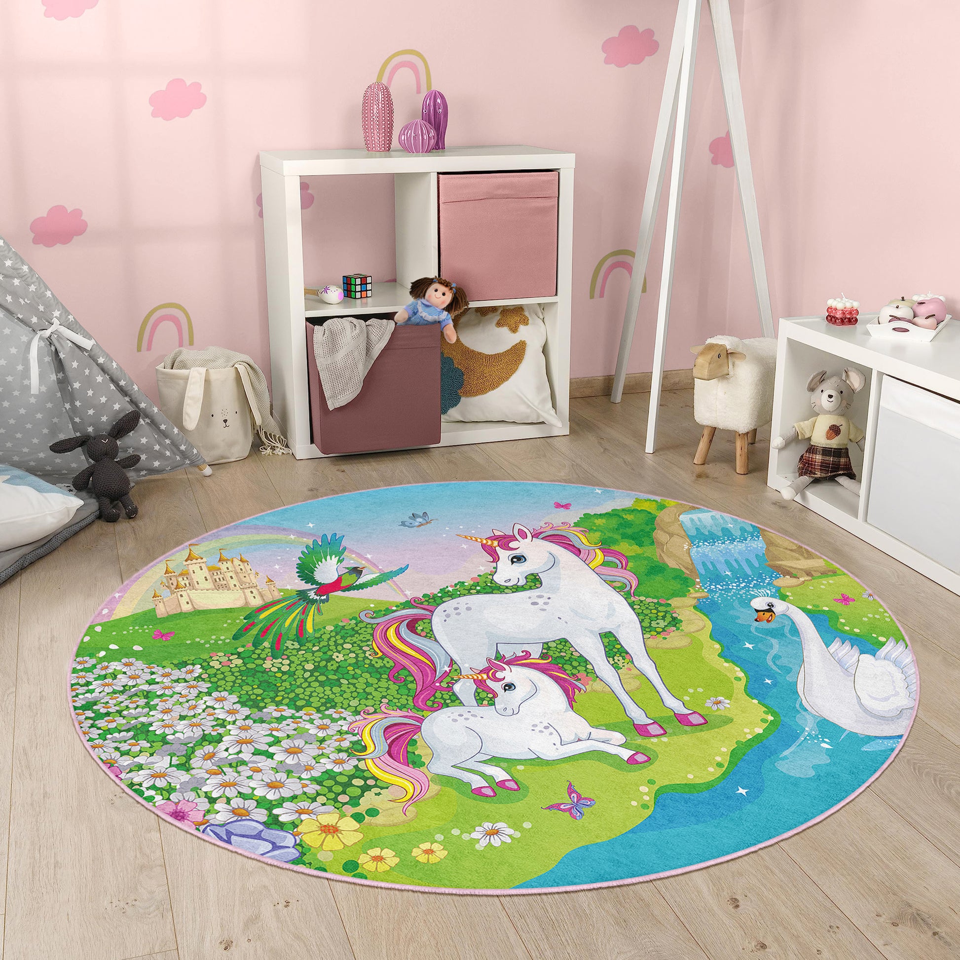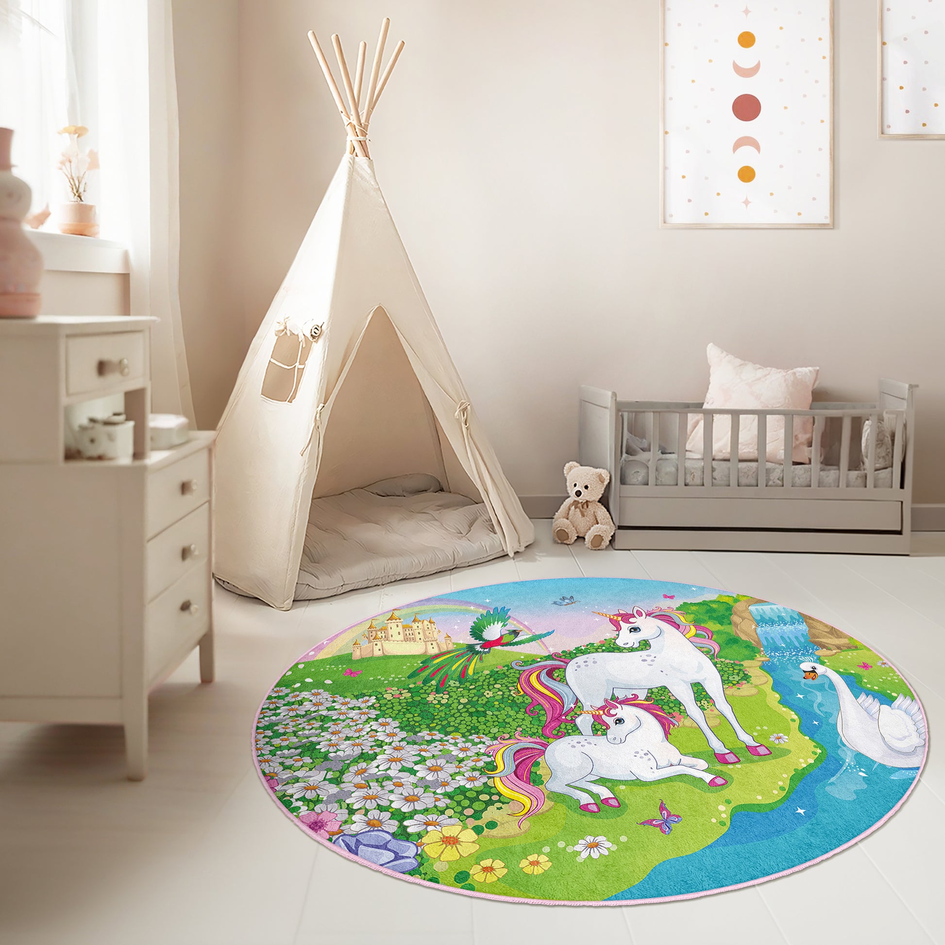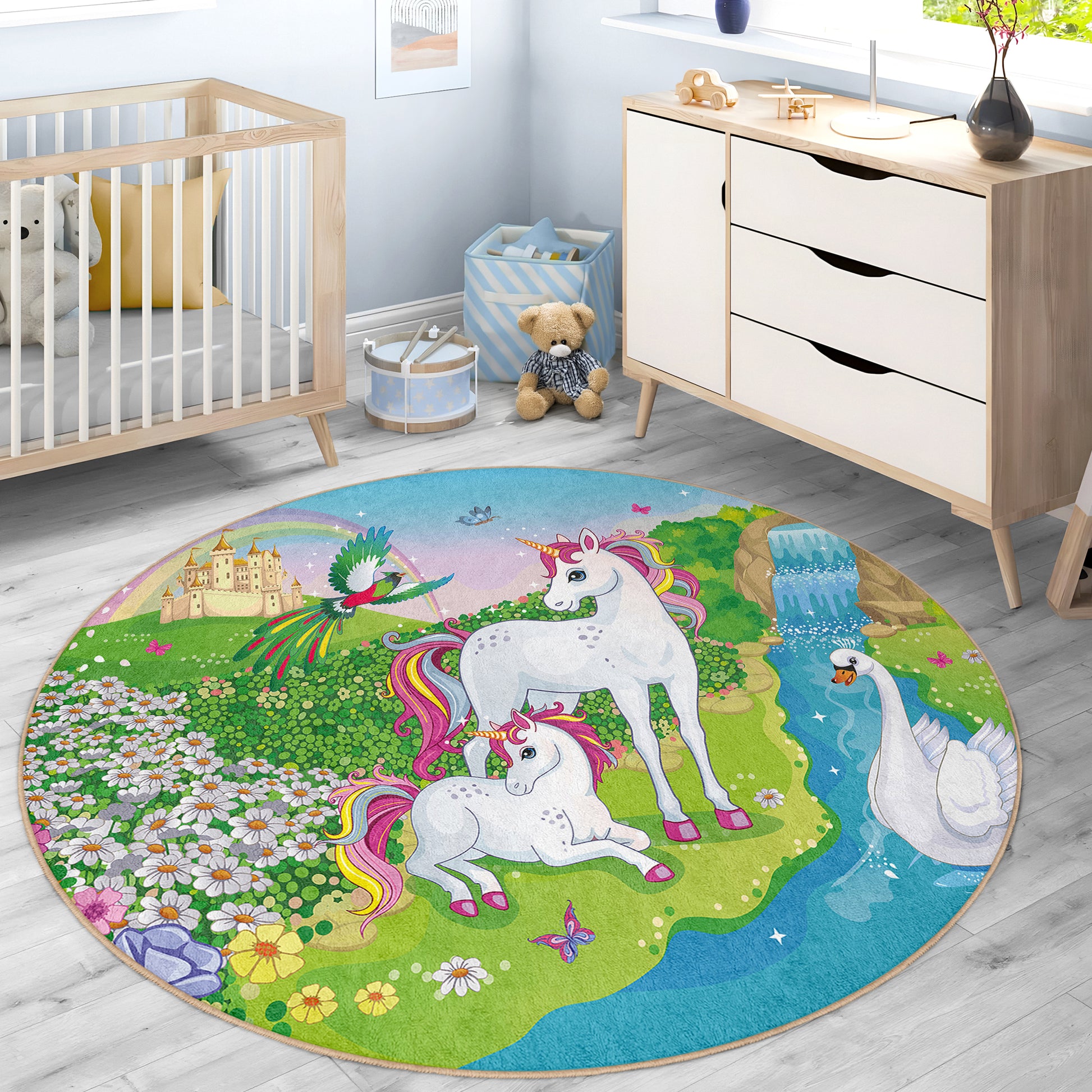 Two Horses Like Ponny and with a Swan in Beatiful Nature Design Washable Anti-Slip Kids Round Rug Multifunction as Non Slip Play Mat - Perfect for Bedrooms, Playrooms & Nurseries - Durable, Safe, & Easy to Clean for Boys & Girls Room 333