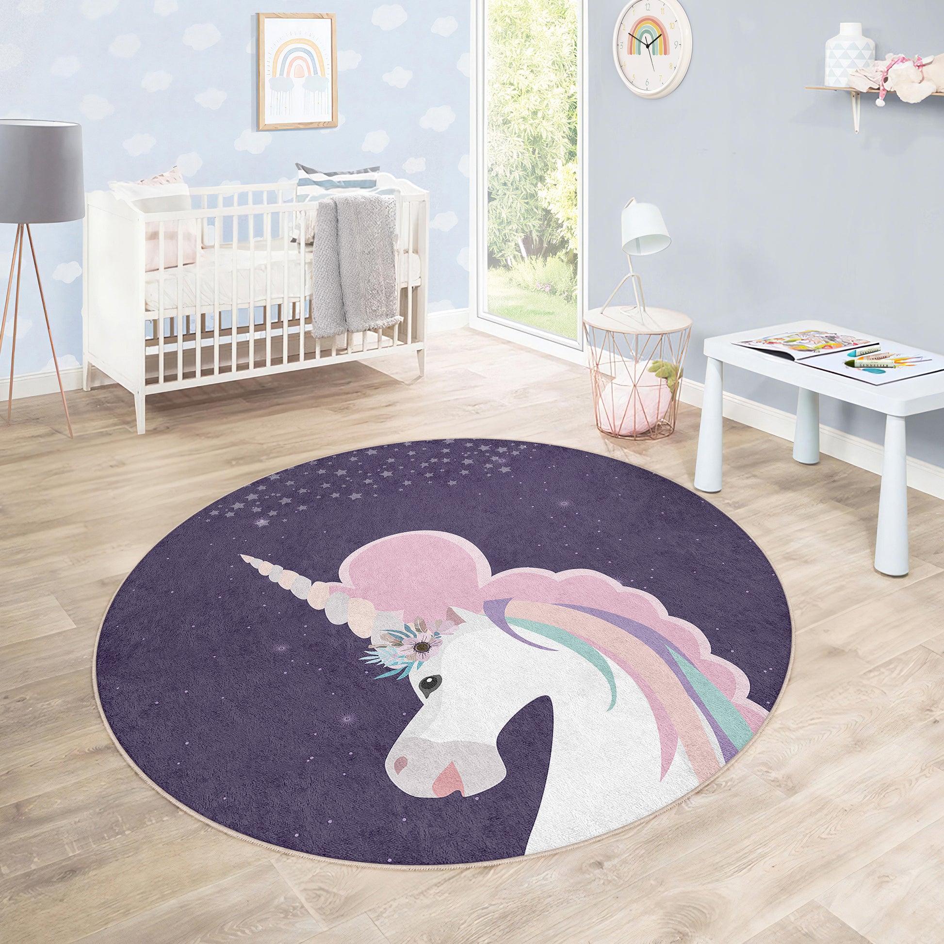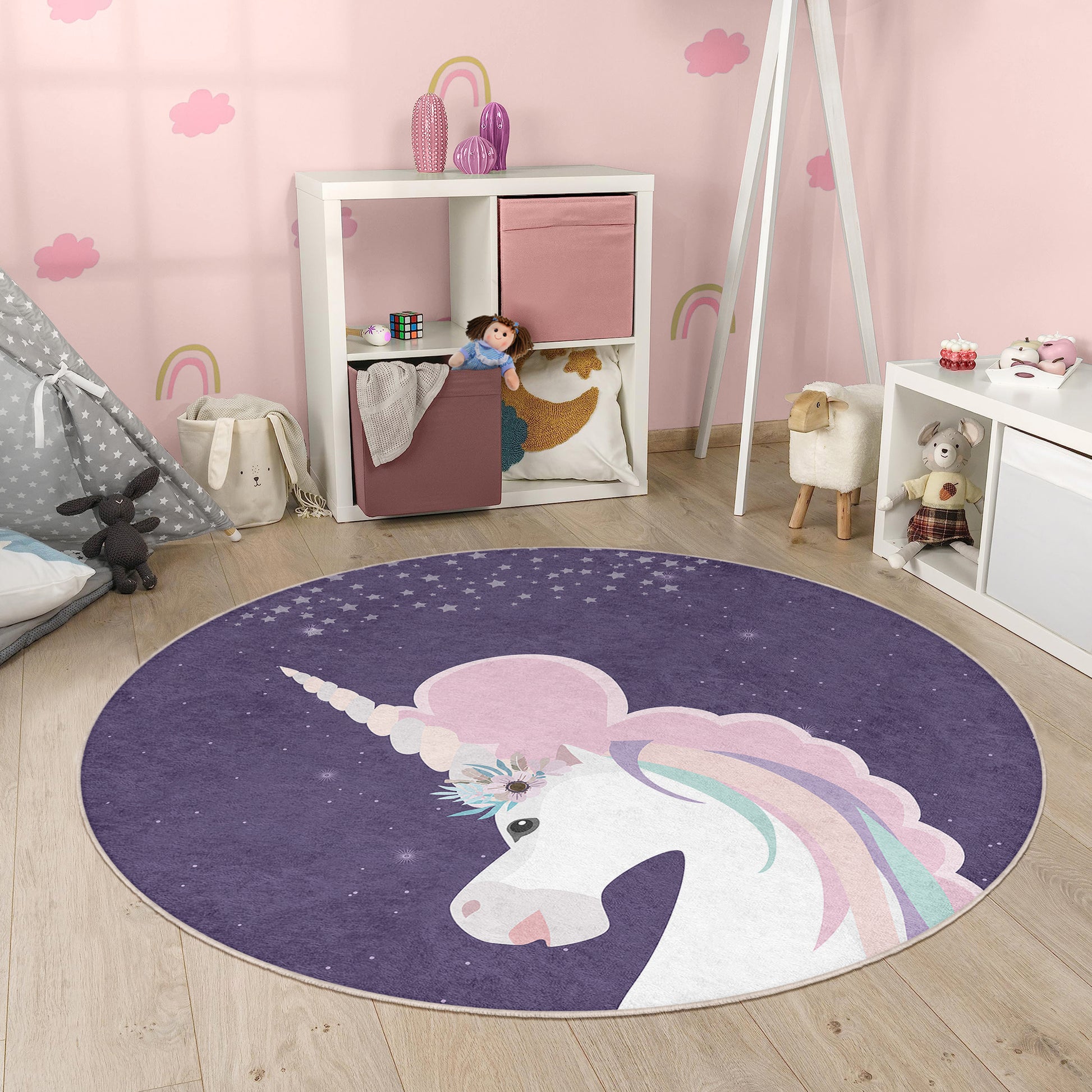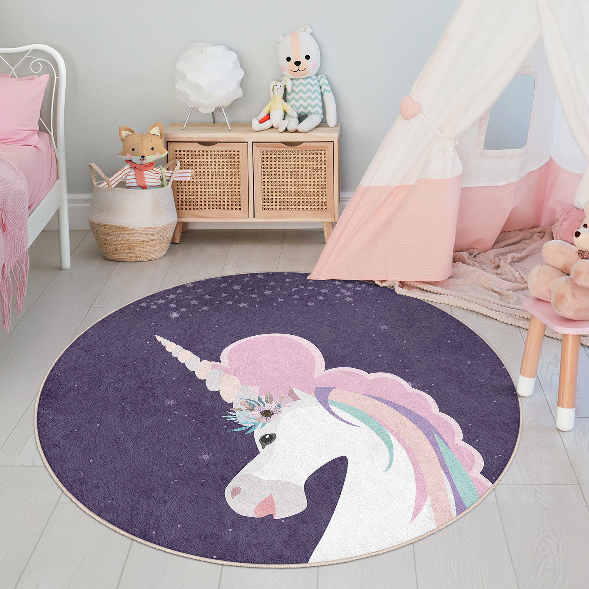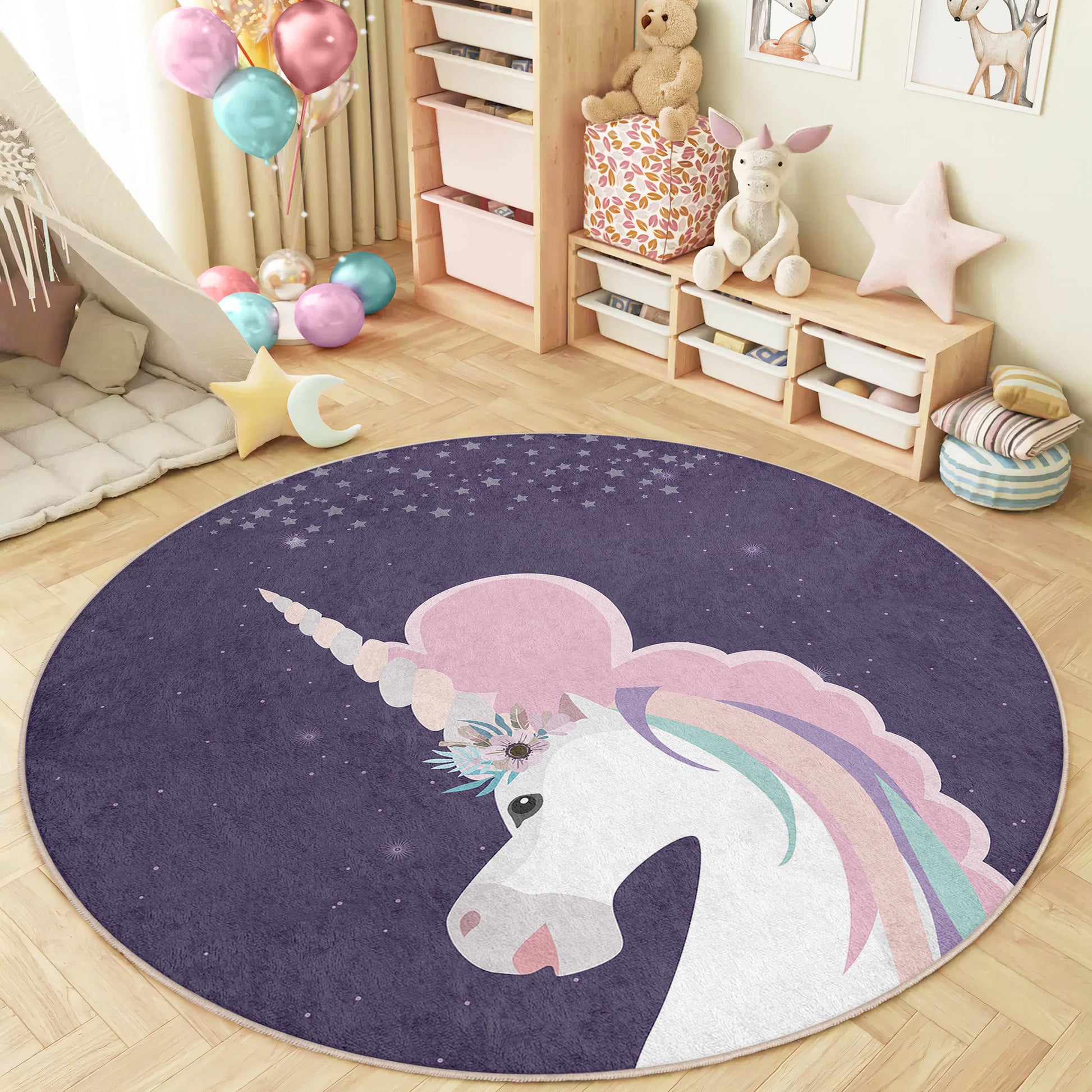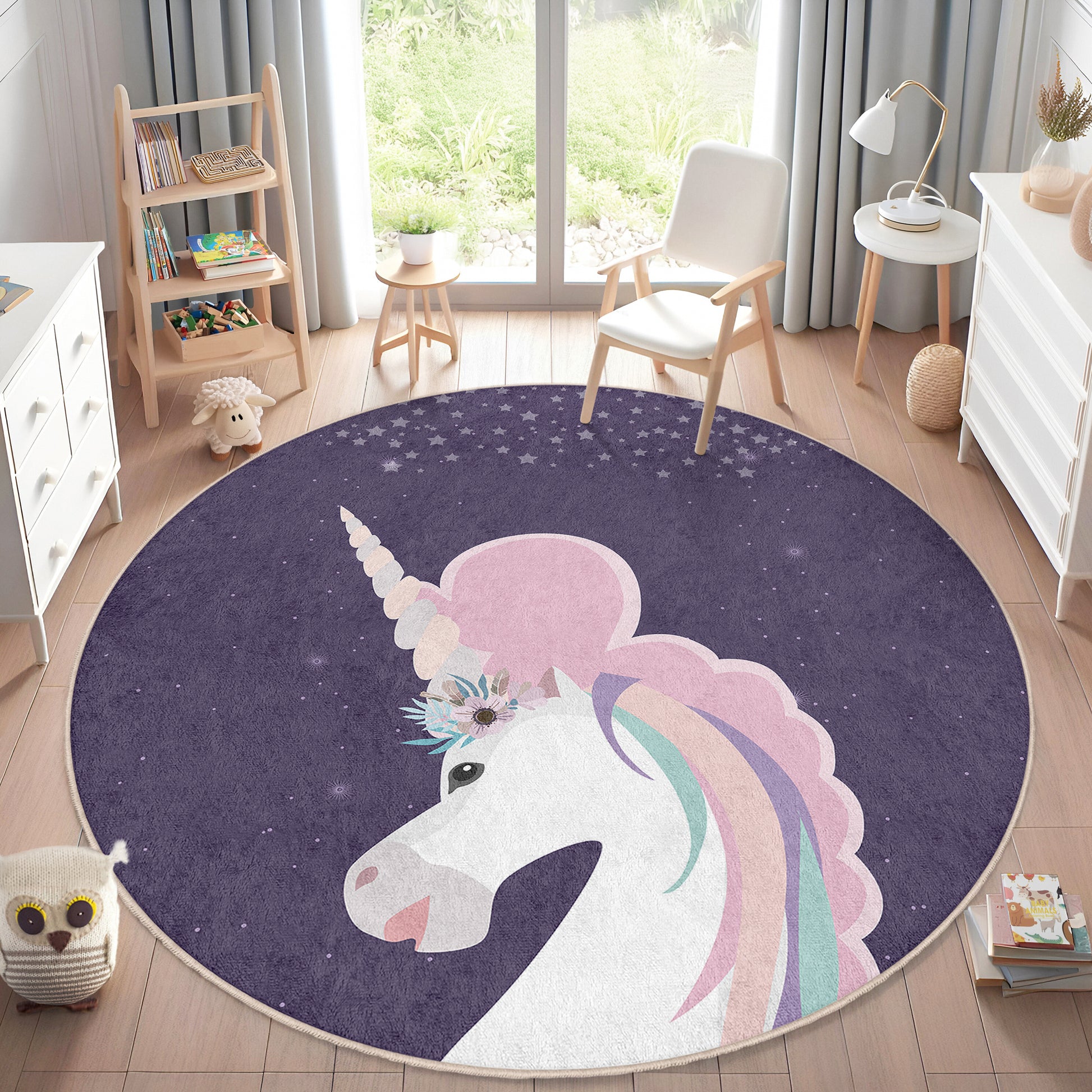 Unicorn Pony Magic World Design Washable Anti-Slip Kids Round Rug Multifunction as Non Slip Play Mat - Perfect for Bedrooms, Playrooms & Nurseries - Durable, Safe, & Easy to Clean for Boys & Girls 310