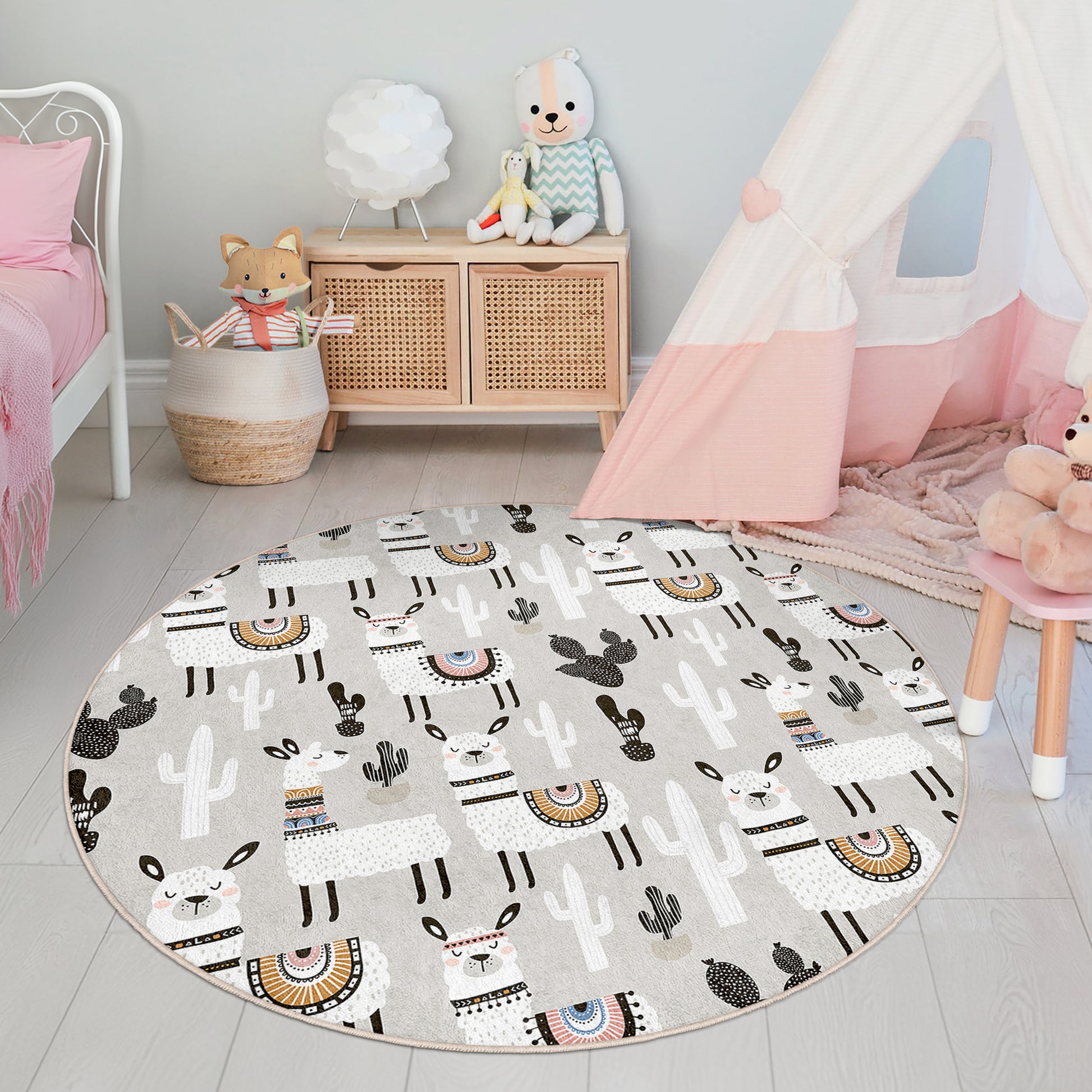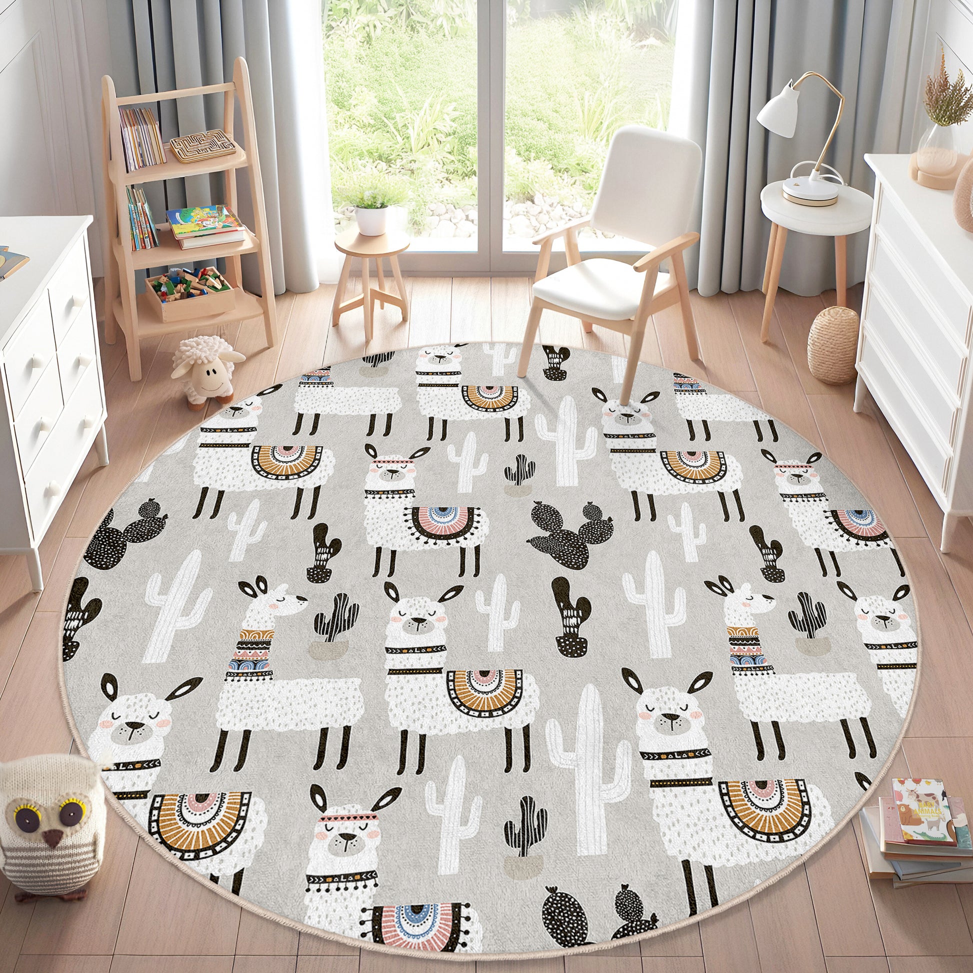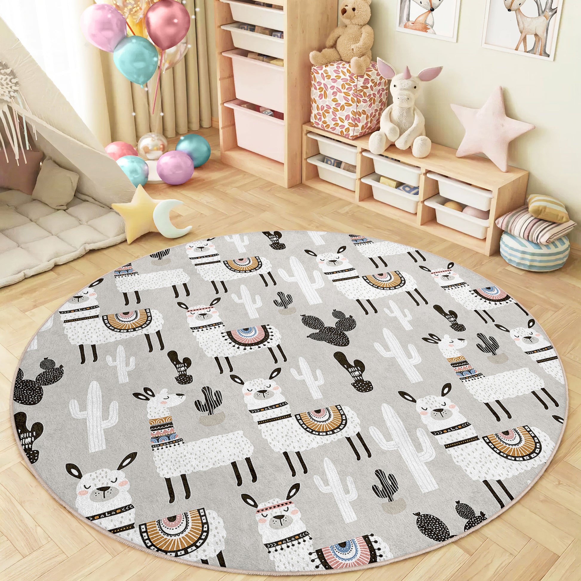 Cactus Rainbow and Lama Design Washable Anti-Slip Kids Round Rug Multifunction as Non Slip Play Mat - Perfect for Bedrooms, Playrooms & Nurseries - Durable, Safe, & Easy to Clean for Boys & Girls 314