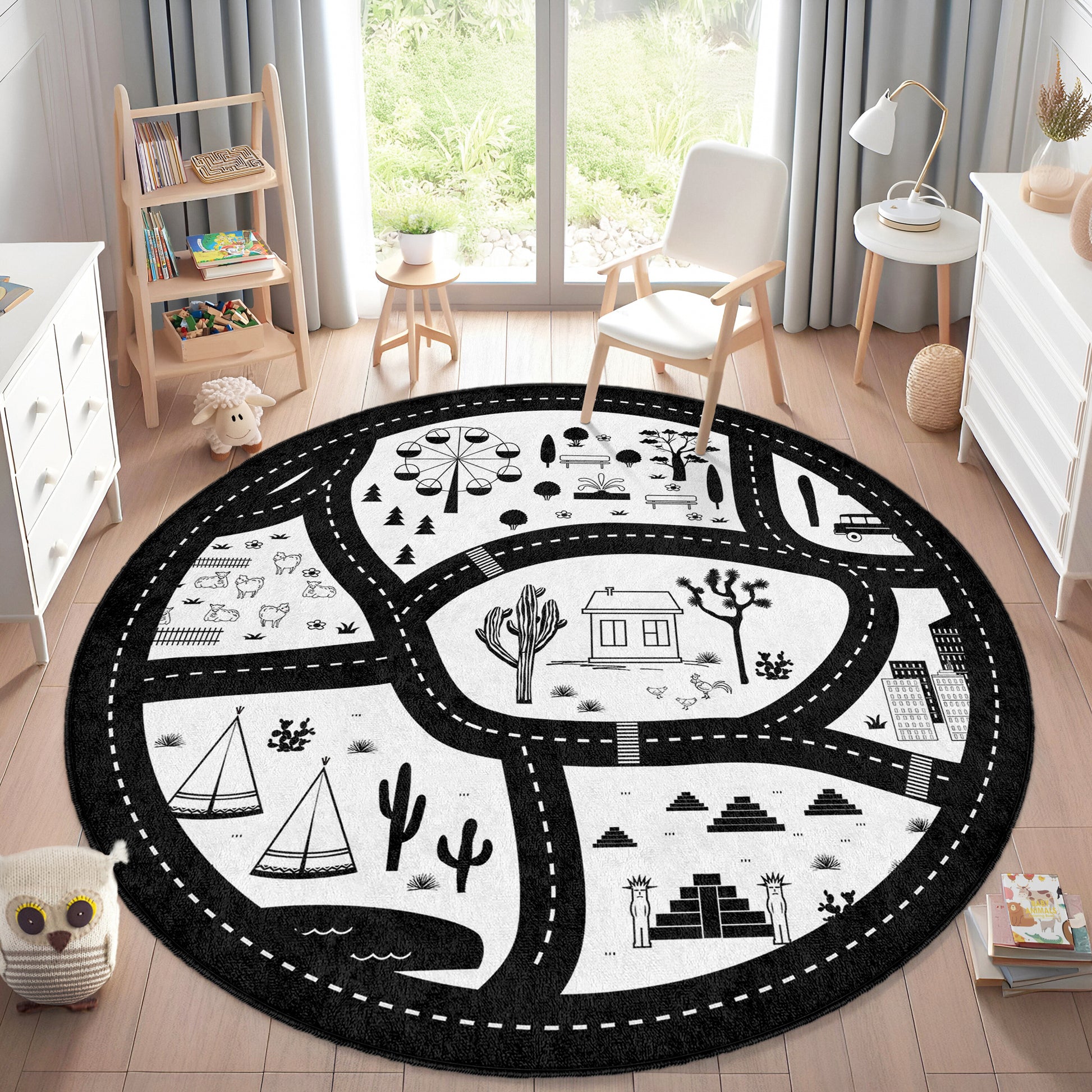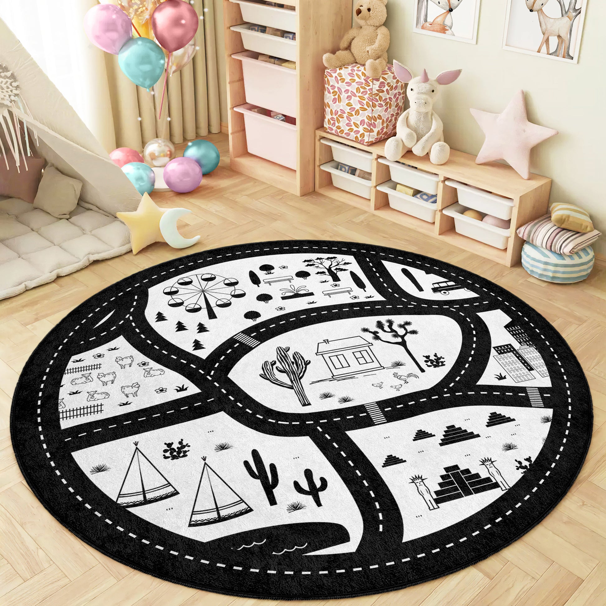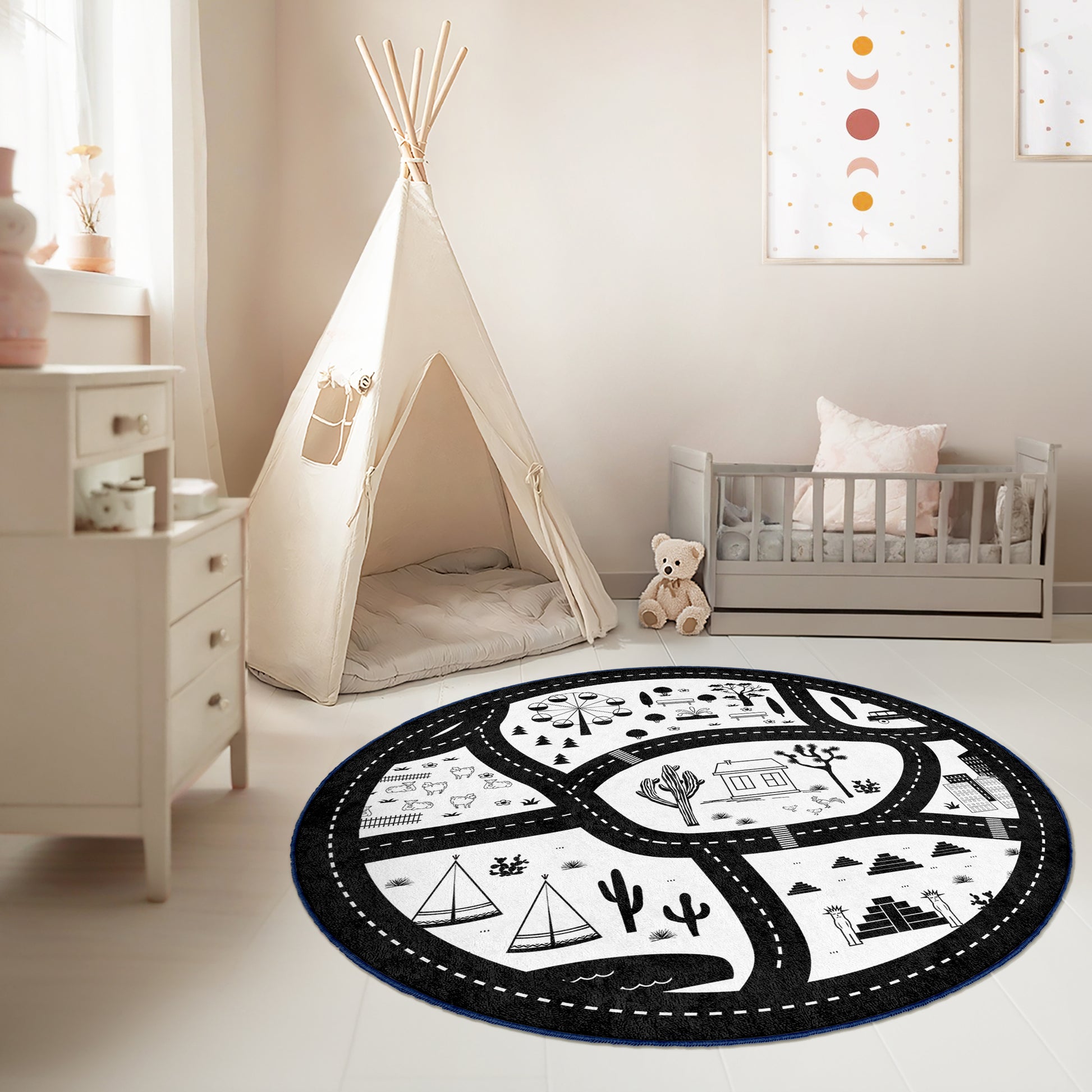 Black And White Minimalist Navy Design Washable Anti-Slip Kids Round Rug Multifunction as Non Slip Play Mat - Perfect for Bedrooms, Playrooms & Nurseries - Durable, Safe, & Easy to Clean for Boys & Girls 317