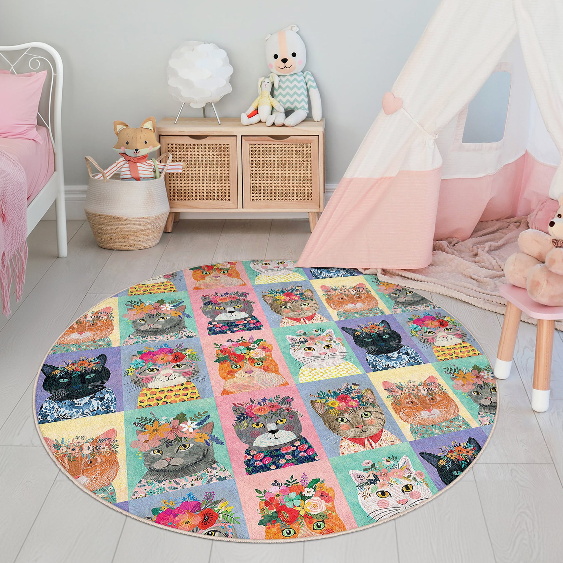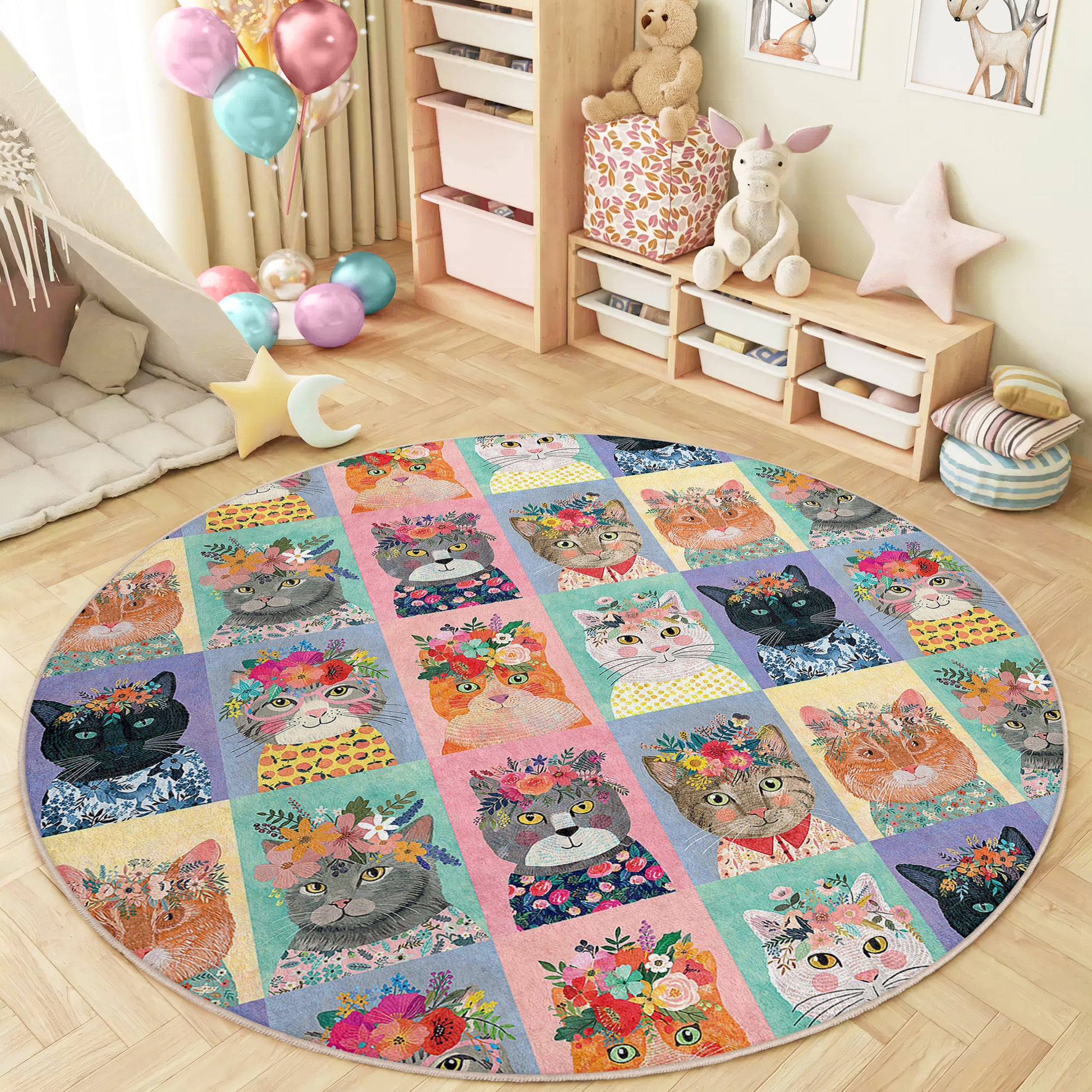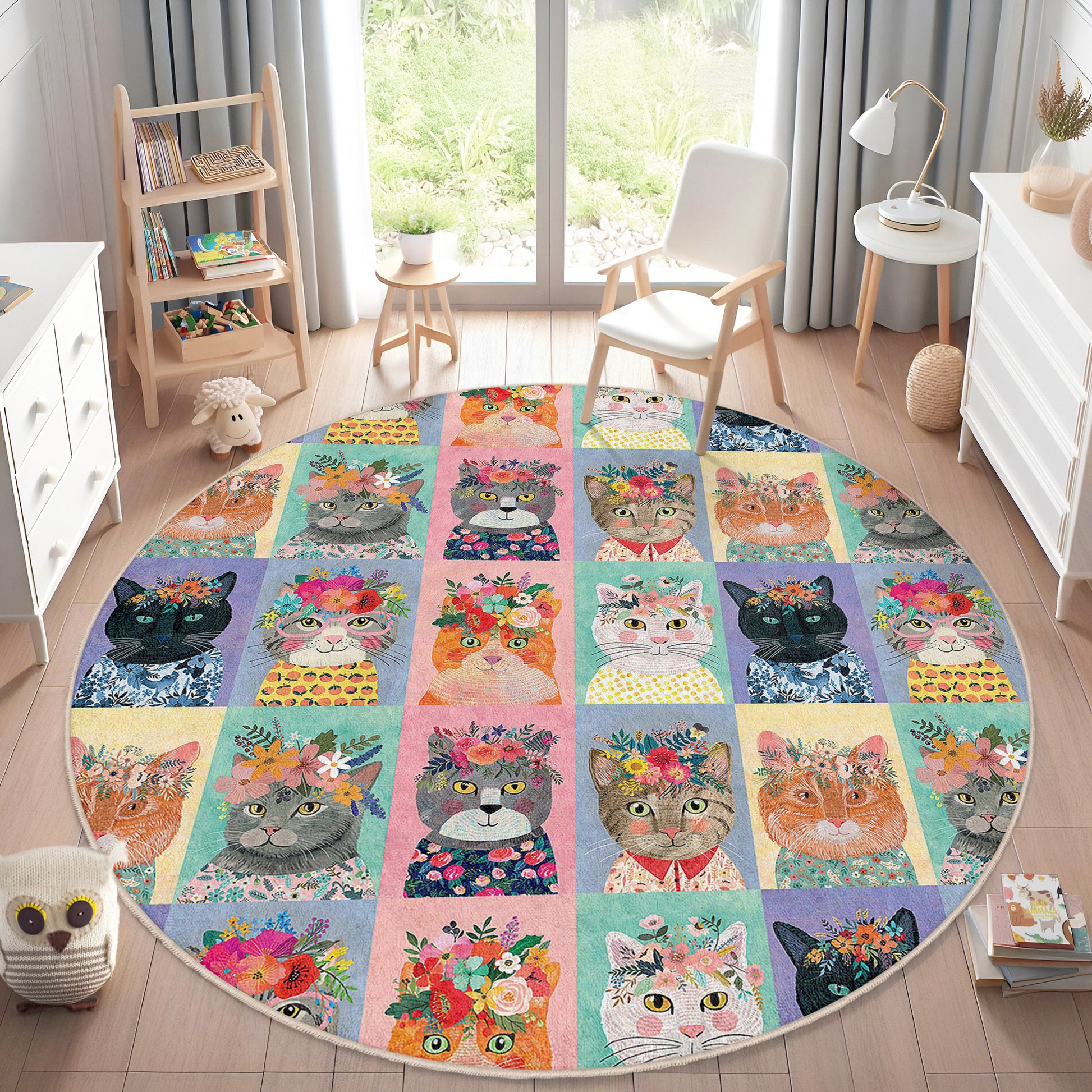 Lovely Cats and Pets Design Washable Anti-Slip Kids Round Rug Multifunction as Non Slip Play Mat - Perfect for Bedrooms, Playrooms & Nurseries - Durable, Safe, & Easy to Clean for Boys & Girls 323