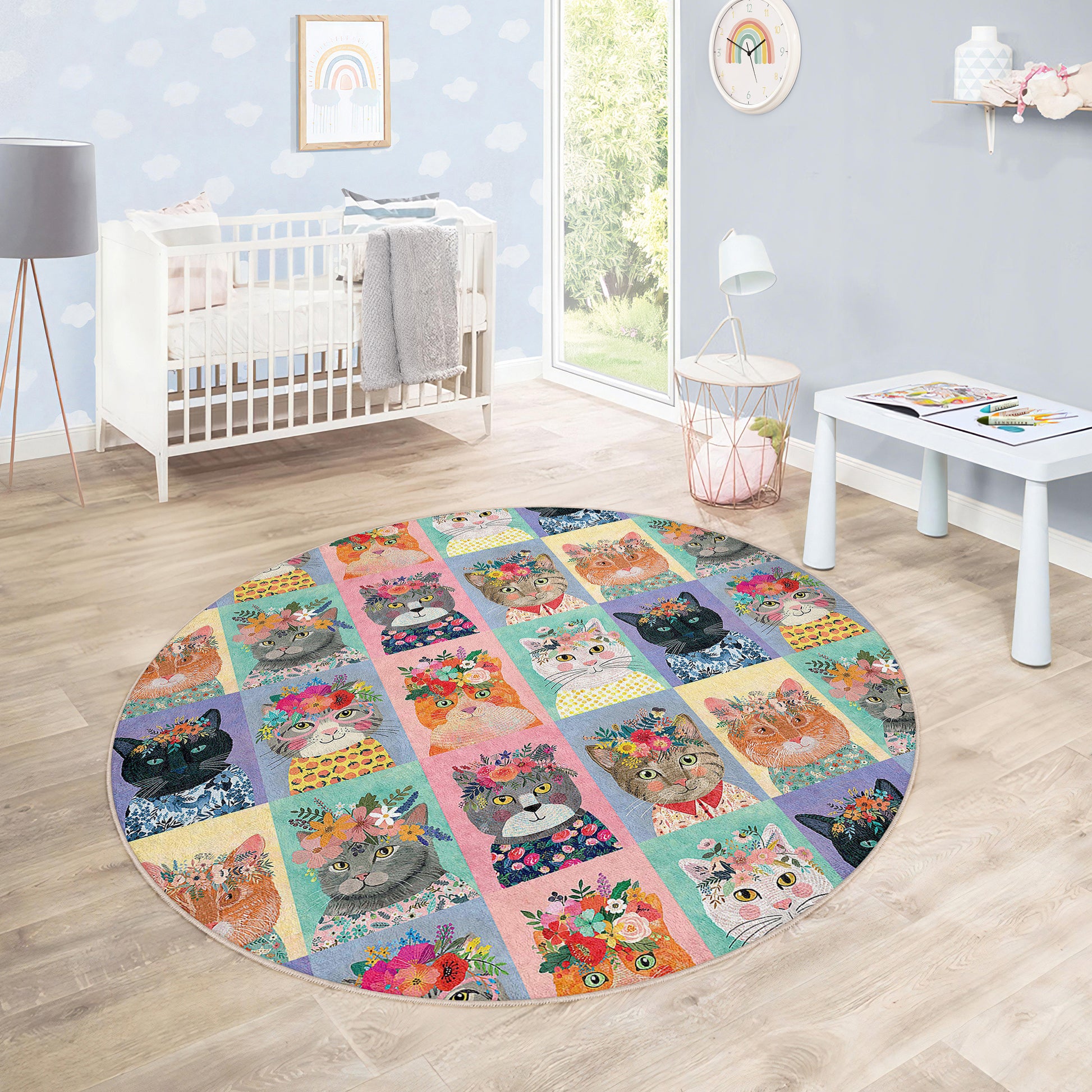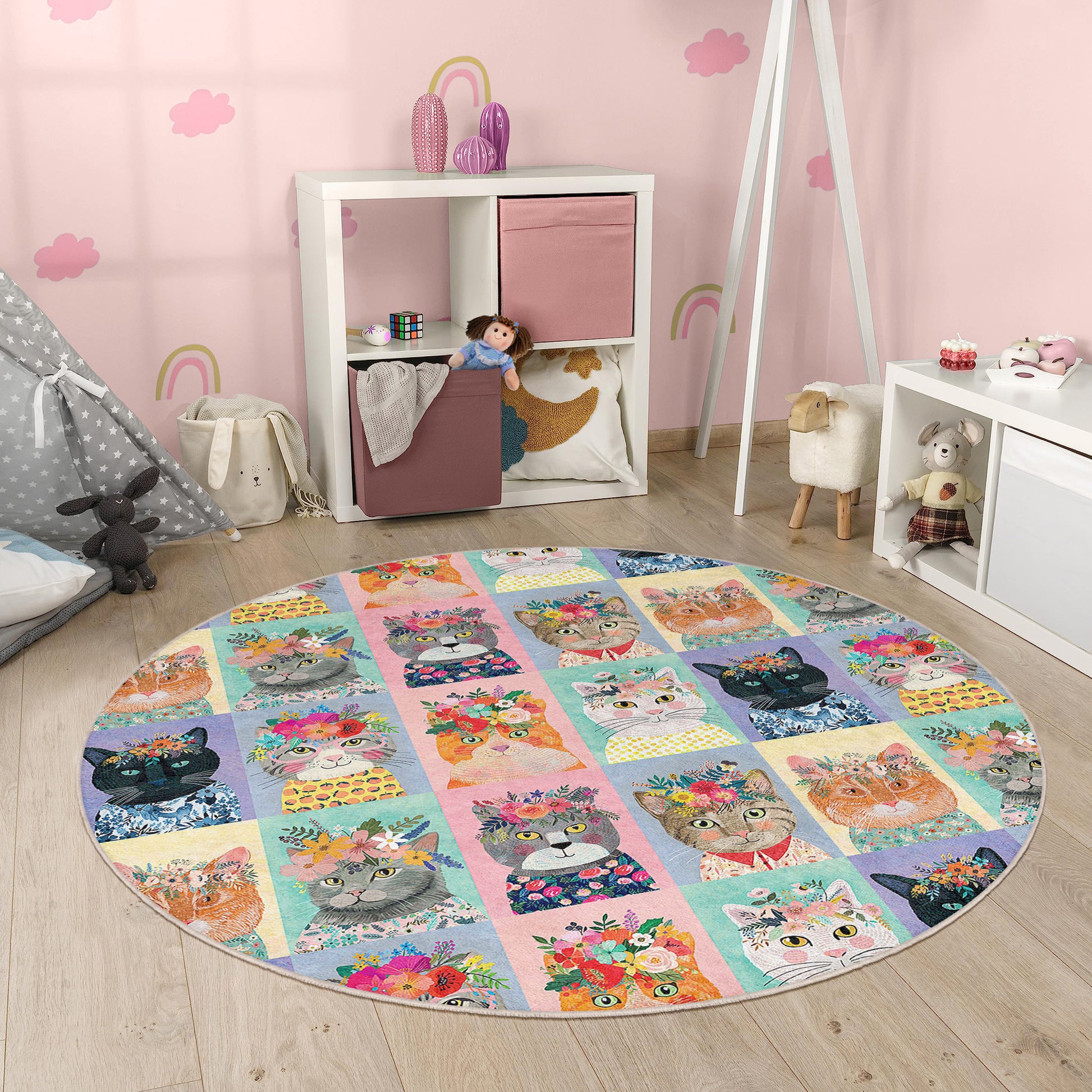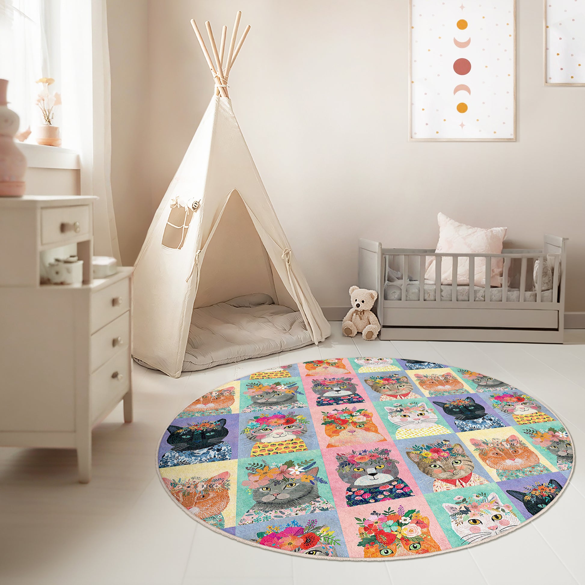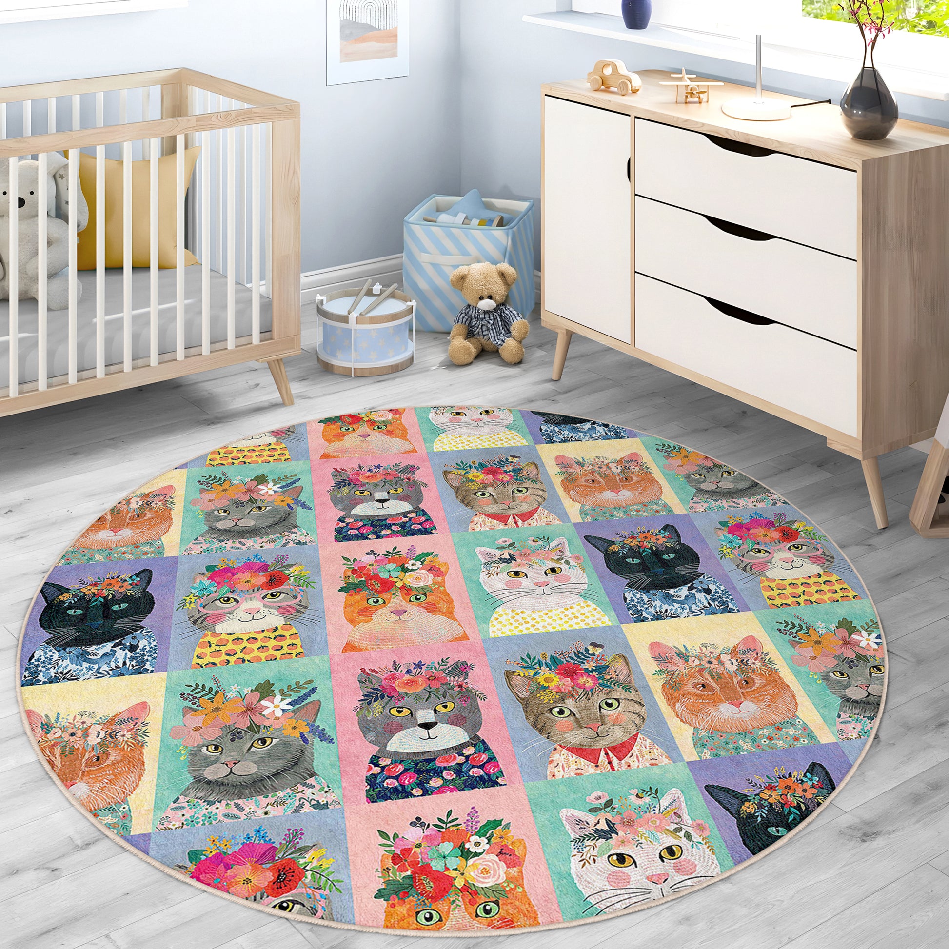 Lovely Cats and Pets Design Washable Anti-Slip Kids Round Rug Multifunction as Non Slip Play Mat - Perfect for Bedrooms, Playrooms & Nurseries - Durable, Safe, & Easy to Clean for Boys & Girls 323