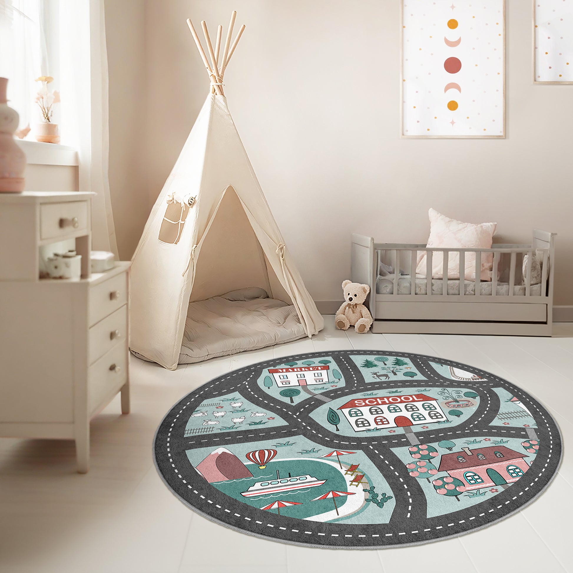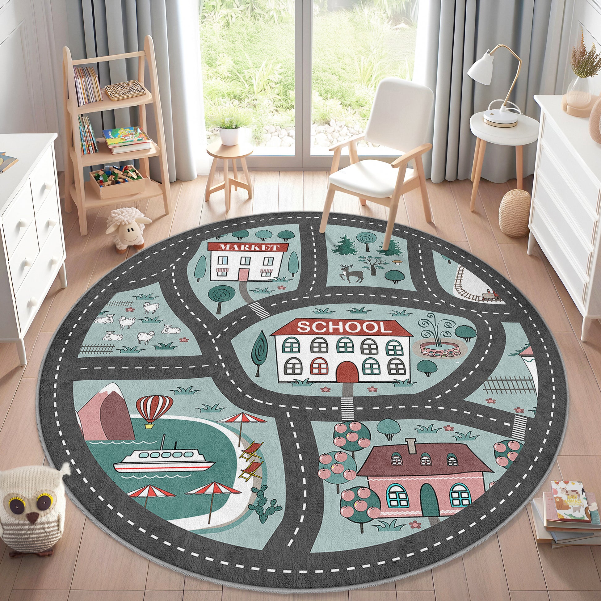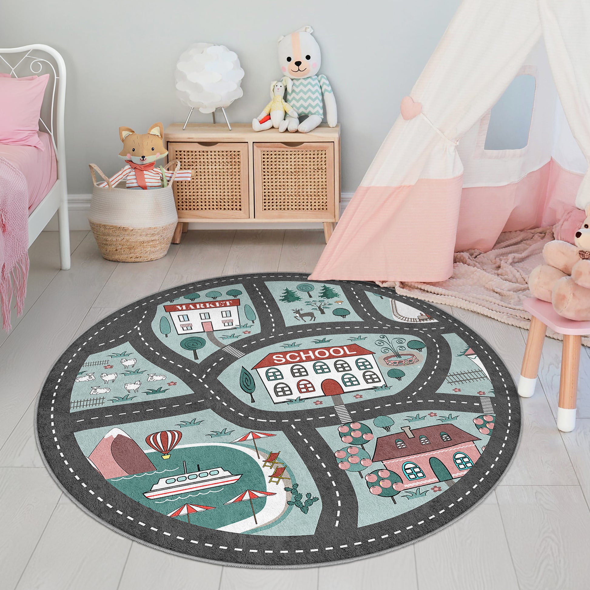 Journey to the School Way with Navy Design Washable Anti-Slip Kids Round Rug Multifunction as Non Slip Play Mat - Perfect for Bedrooms, Playrooms & Nurseries - Durable, Safe, & Easy to Clean for Boys & Girls 319
