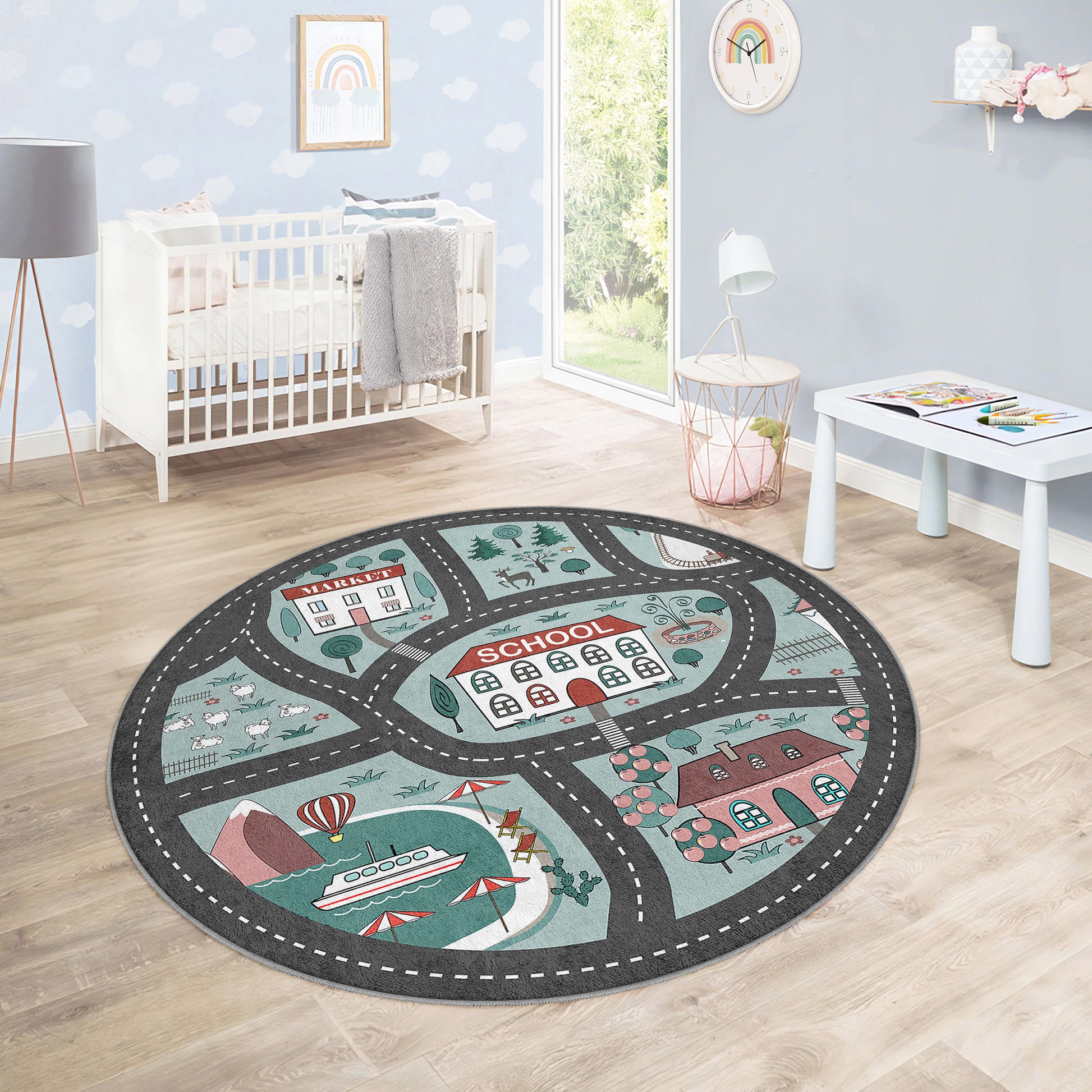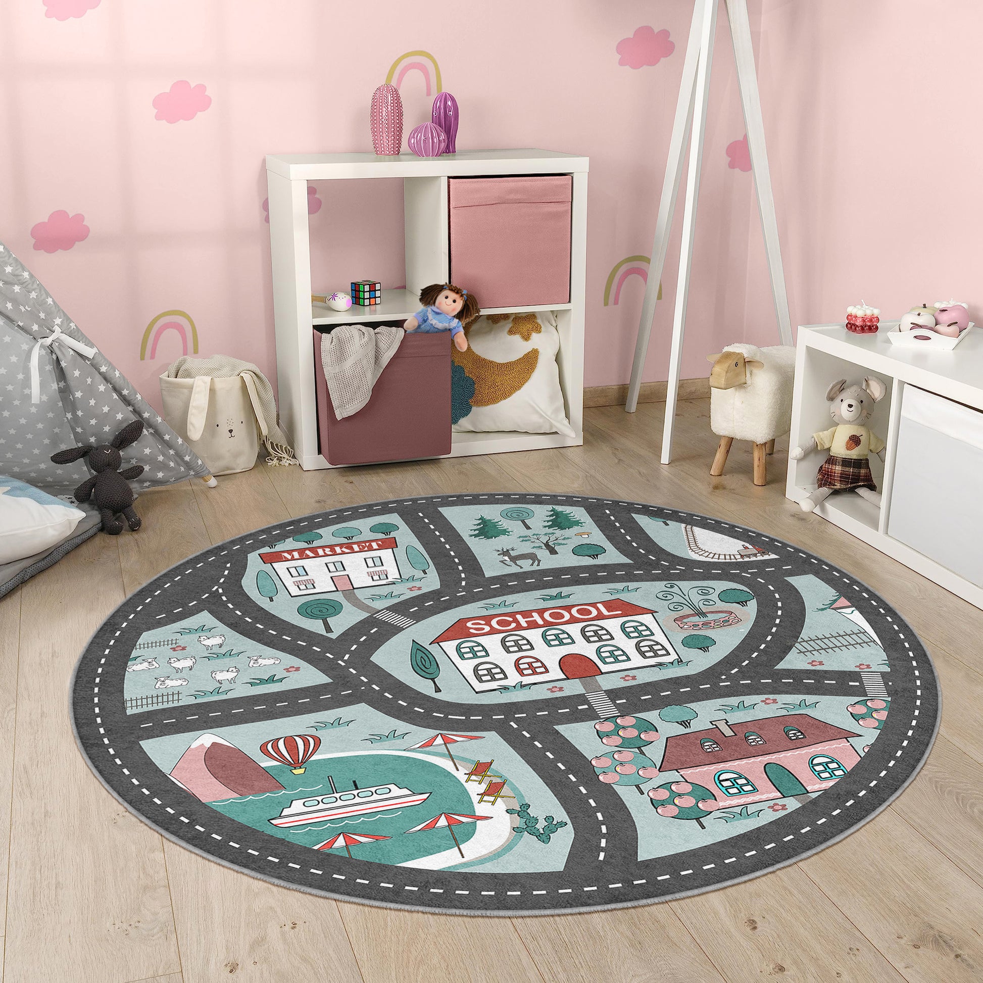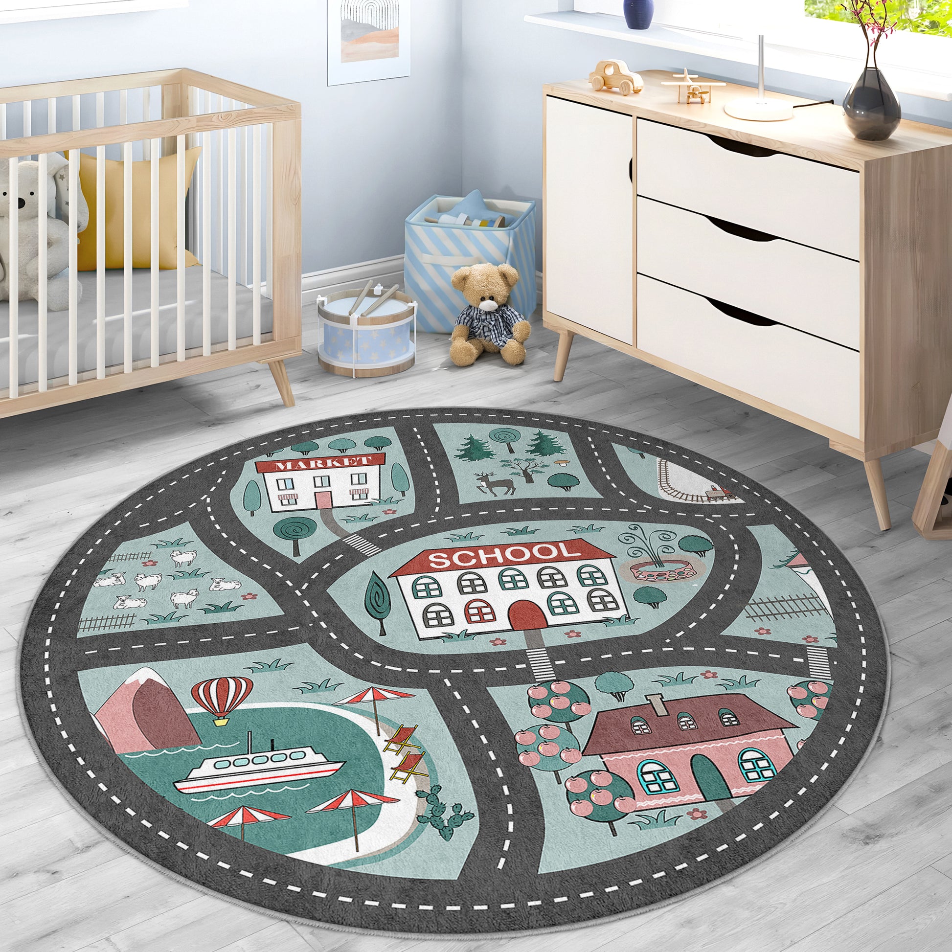Journey to the School Way with Navy Design Washable Anti-Slip Kids Round Rug Multifunction as Non Slip Play Mat - Perfect for Bedrooms, Playrooms & Nurseries - Durable, Safe, & Easy to Clean for Boys & Girls 319