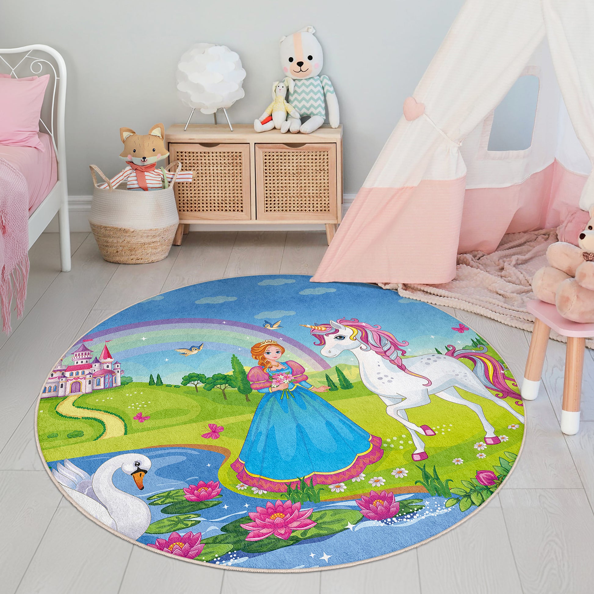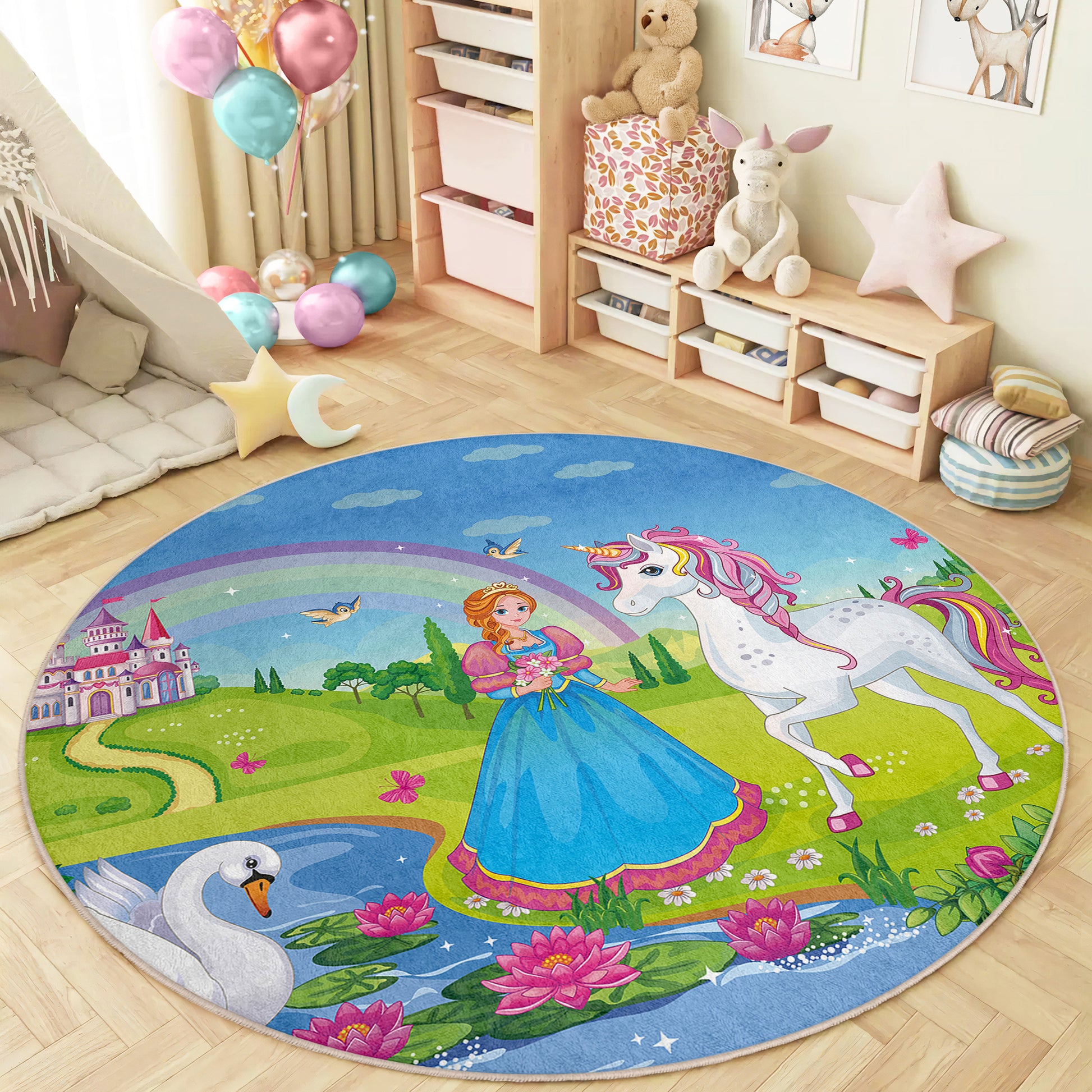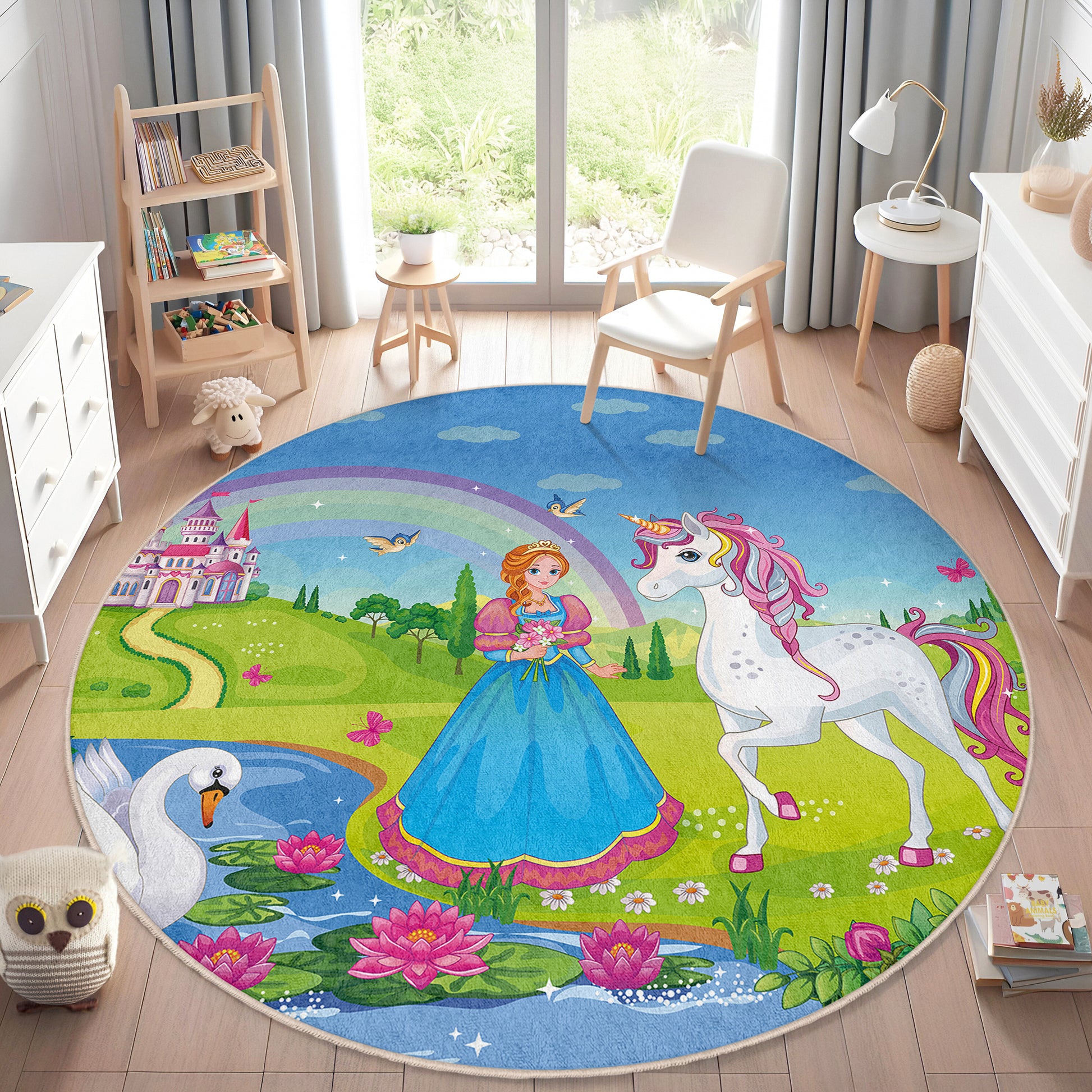 Princess Design with Ponny and Rainbow nearby a River Design Washable Anti-Slip Kids Round Rug Multifunction as Non Slip Play Mat - Perfect for Bedrooms, Playrooms & Nurseries - Durable, Safe, & Easy to Clean for Boys & Girls Room 335