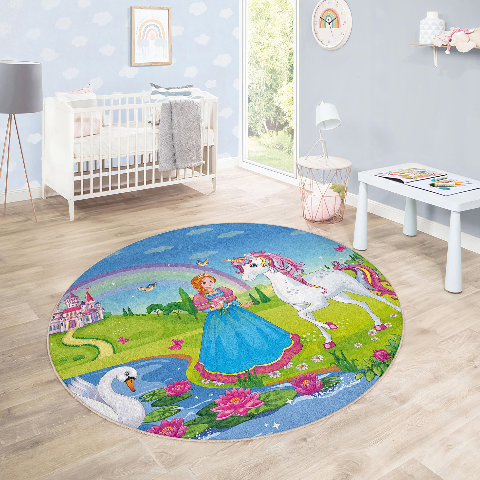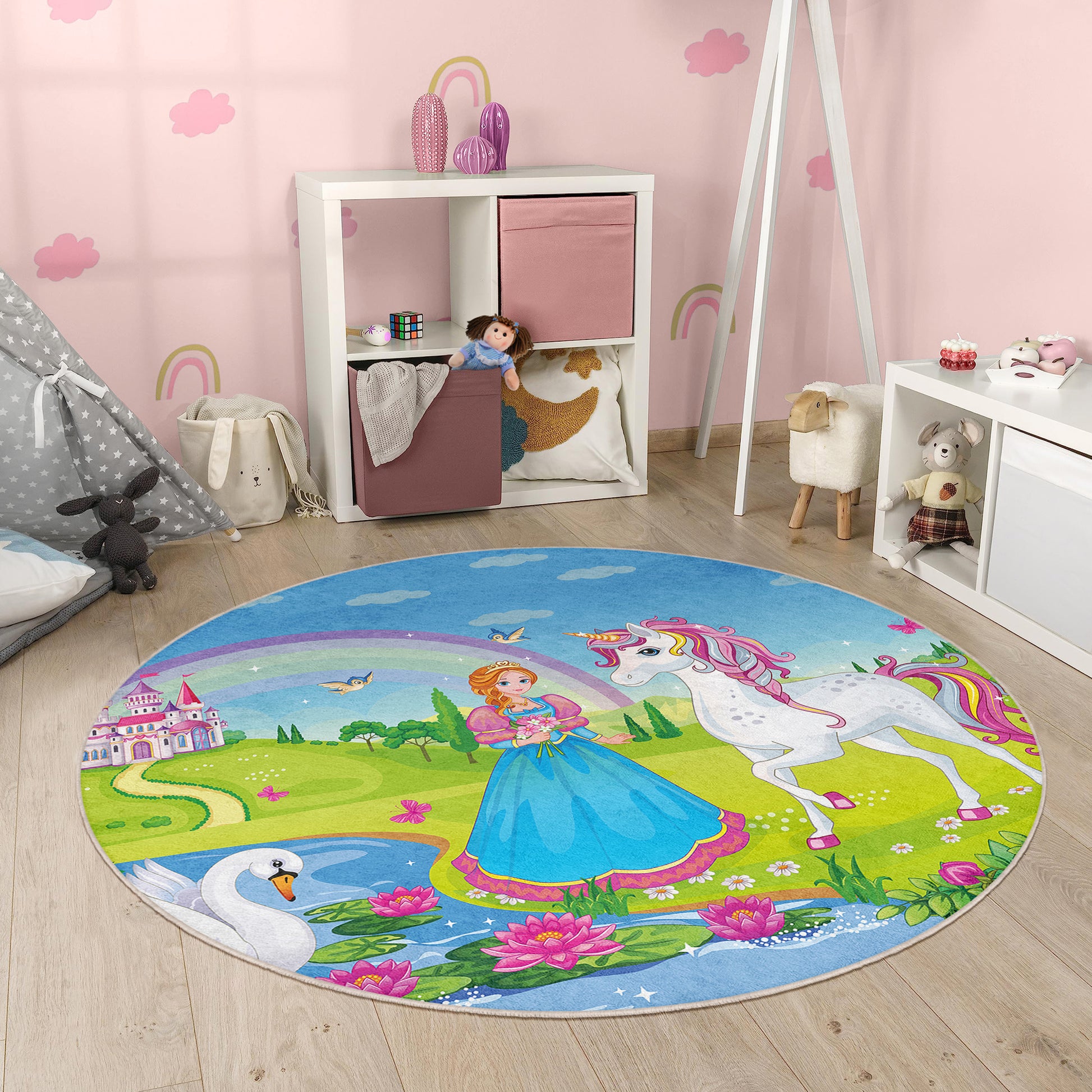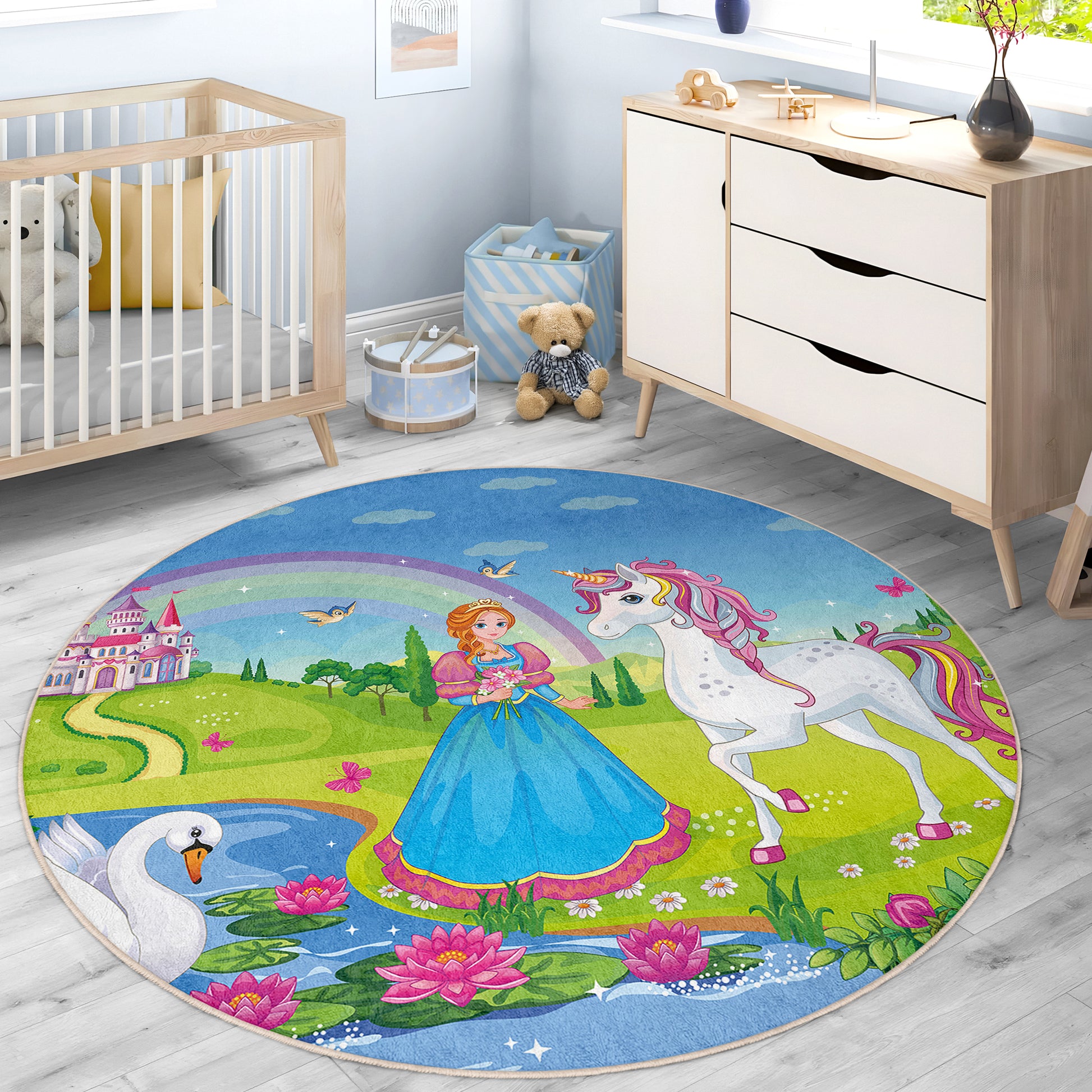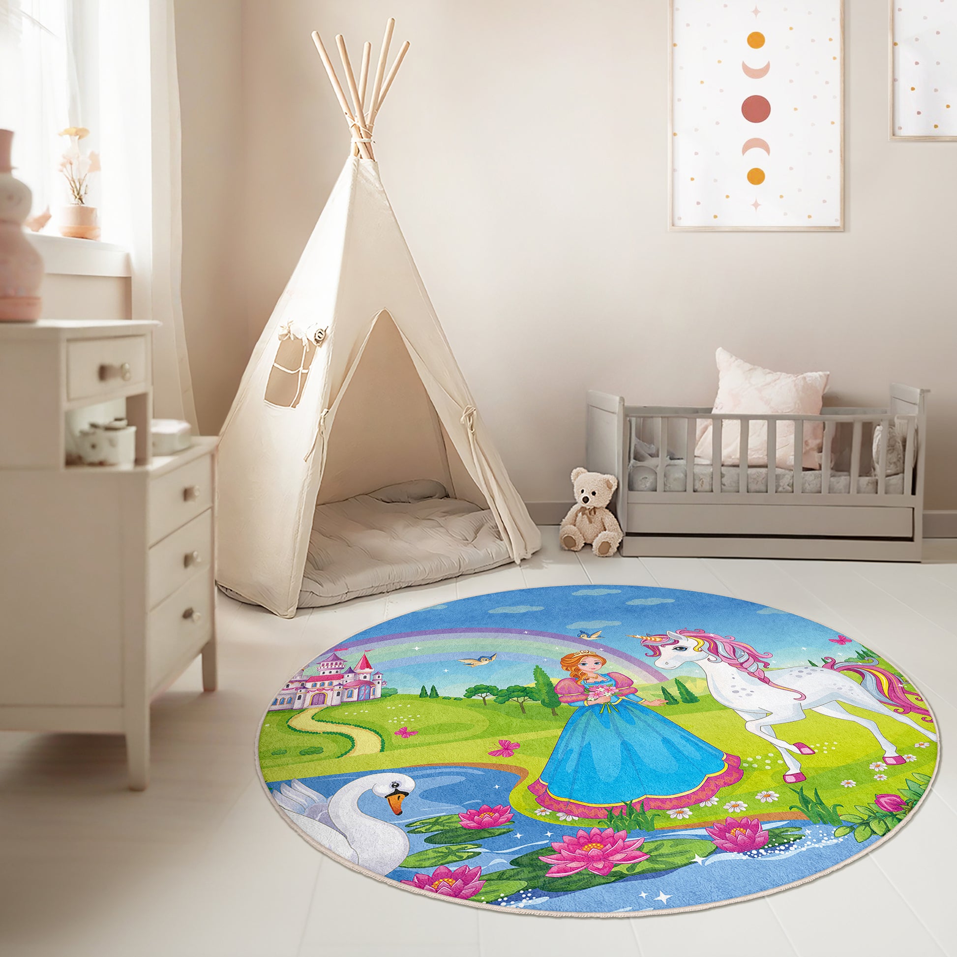 Princess Design with Ponny and Rainbow nearby a River Design Washable Anti-Slip Kids Round Rug Multifunction as Non Slip Play Mat - Perfect for Bedrooms, Playrooms & Nurseries - Durable, Safe, & Easy to Clean for Boys & Girls Room 335