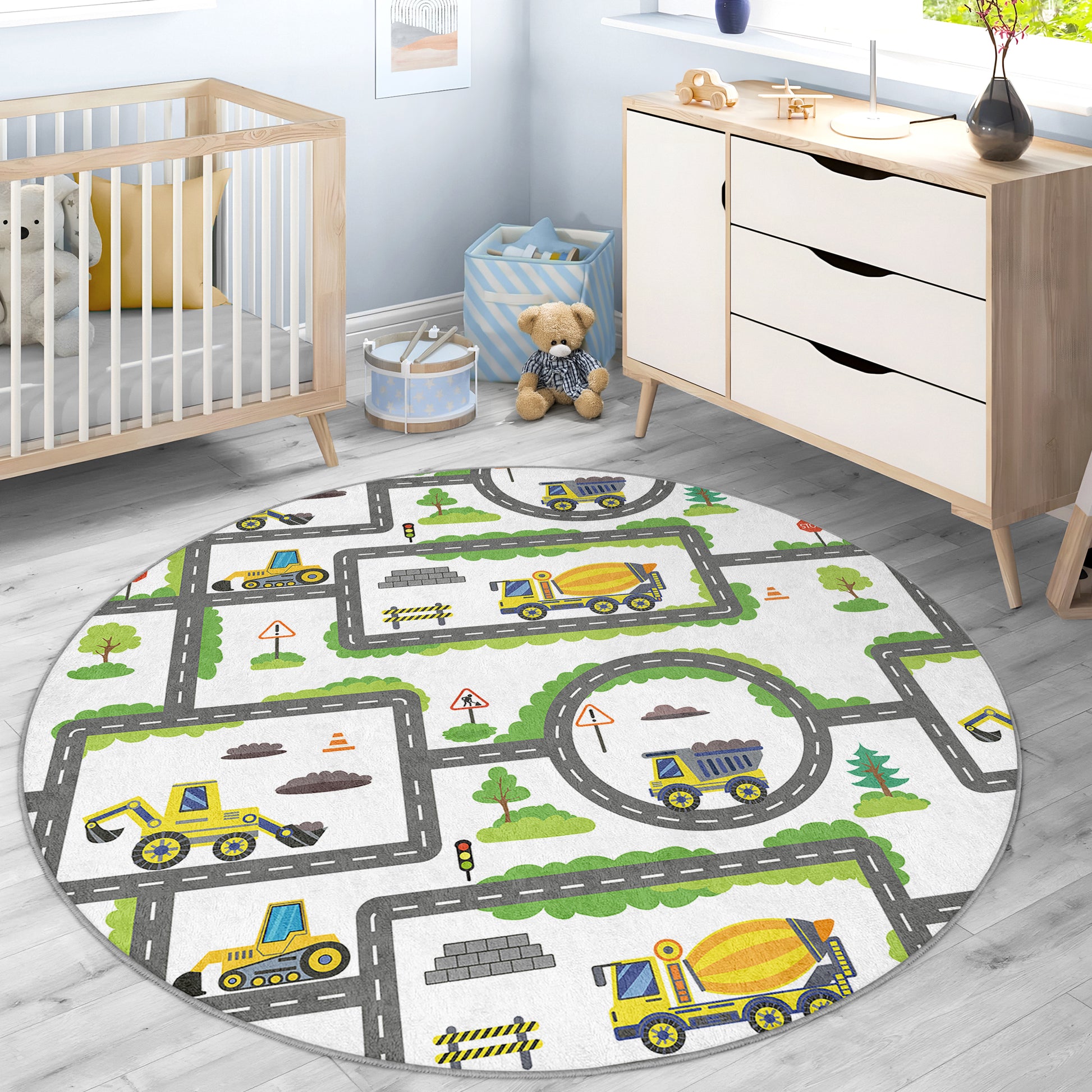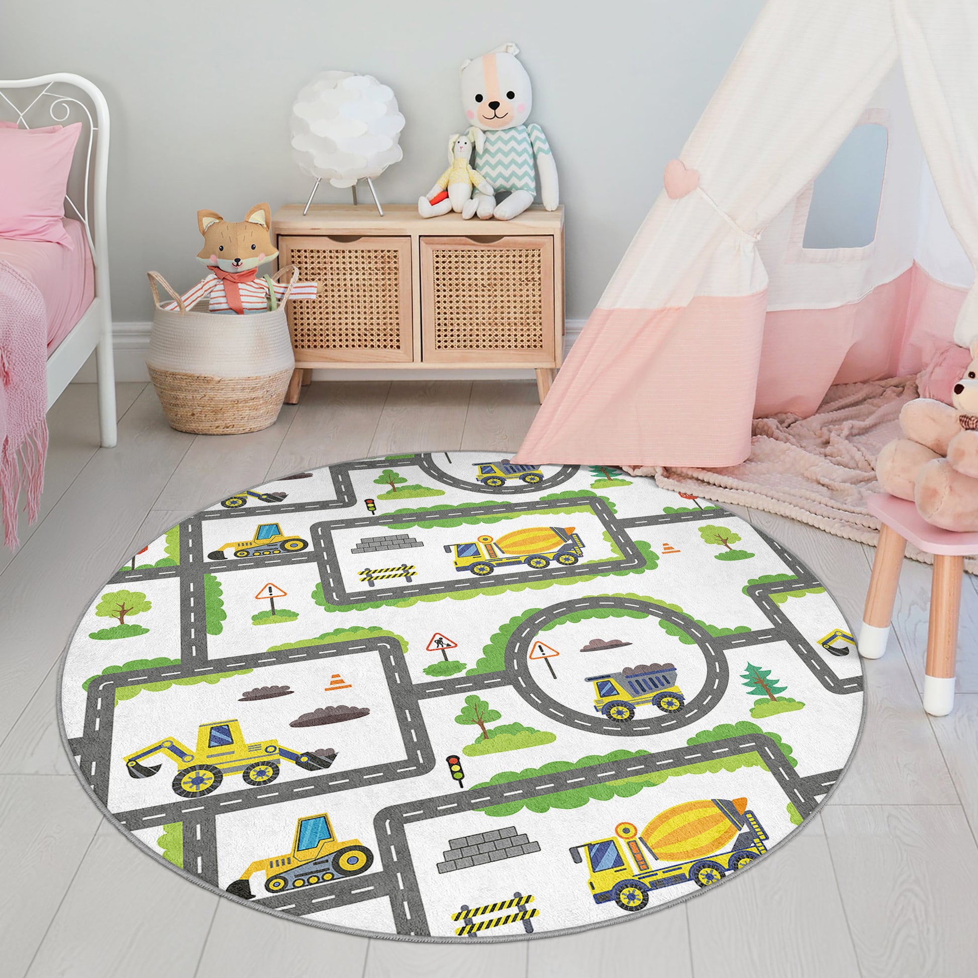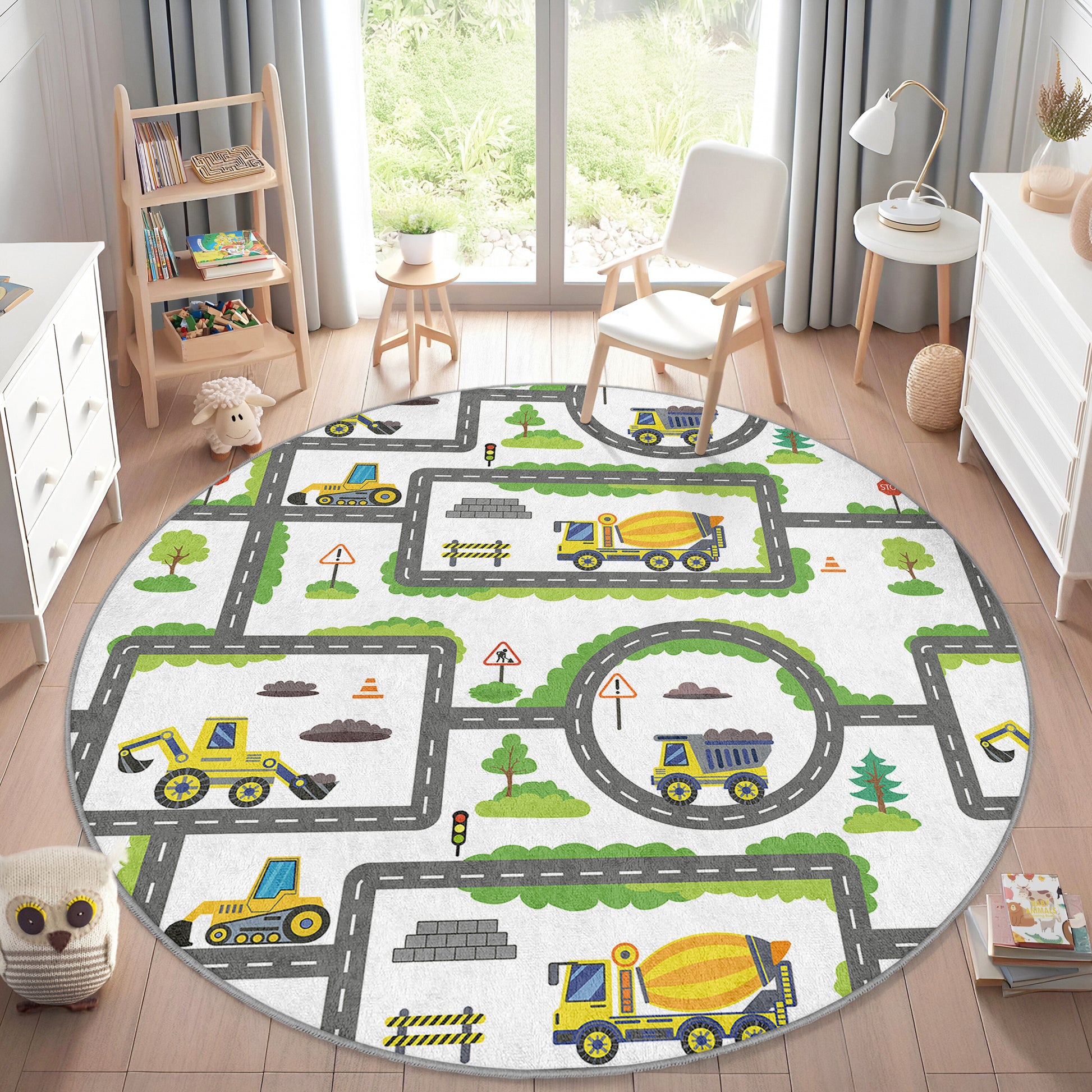 Construction Design for Boys Room Design Washable Anti-Slip Kids Round Rug Multifunction as Non Slip Play Mat - Perfect for Bedrooms, Playrooms & Nurseries - Durable, Safe, & Easy to Clean for Boys & Girls 324
