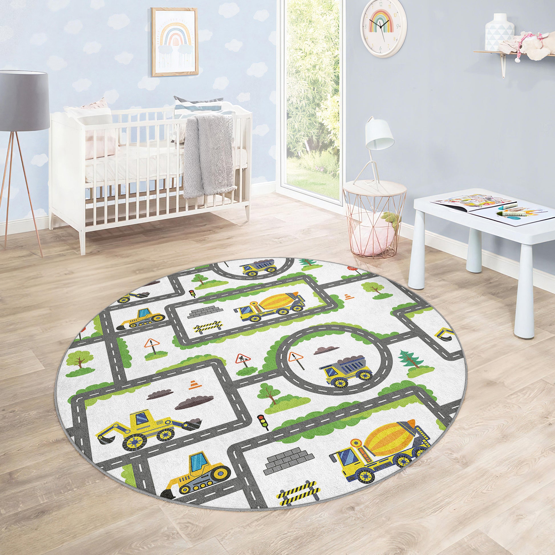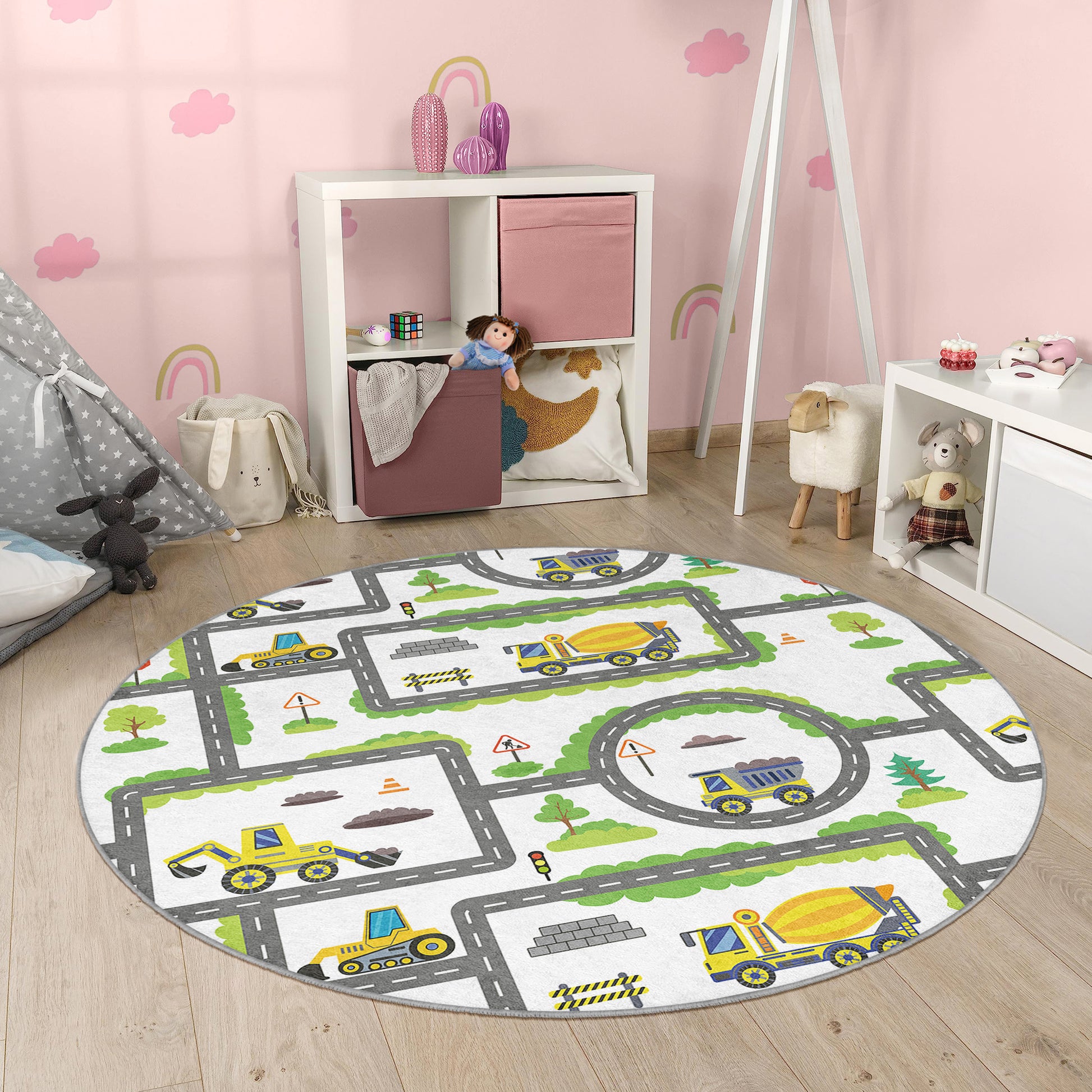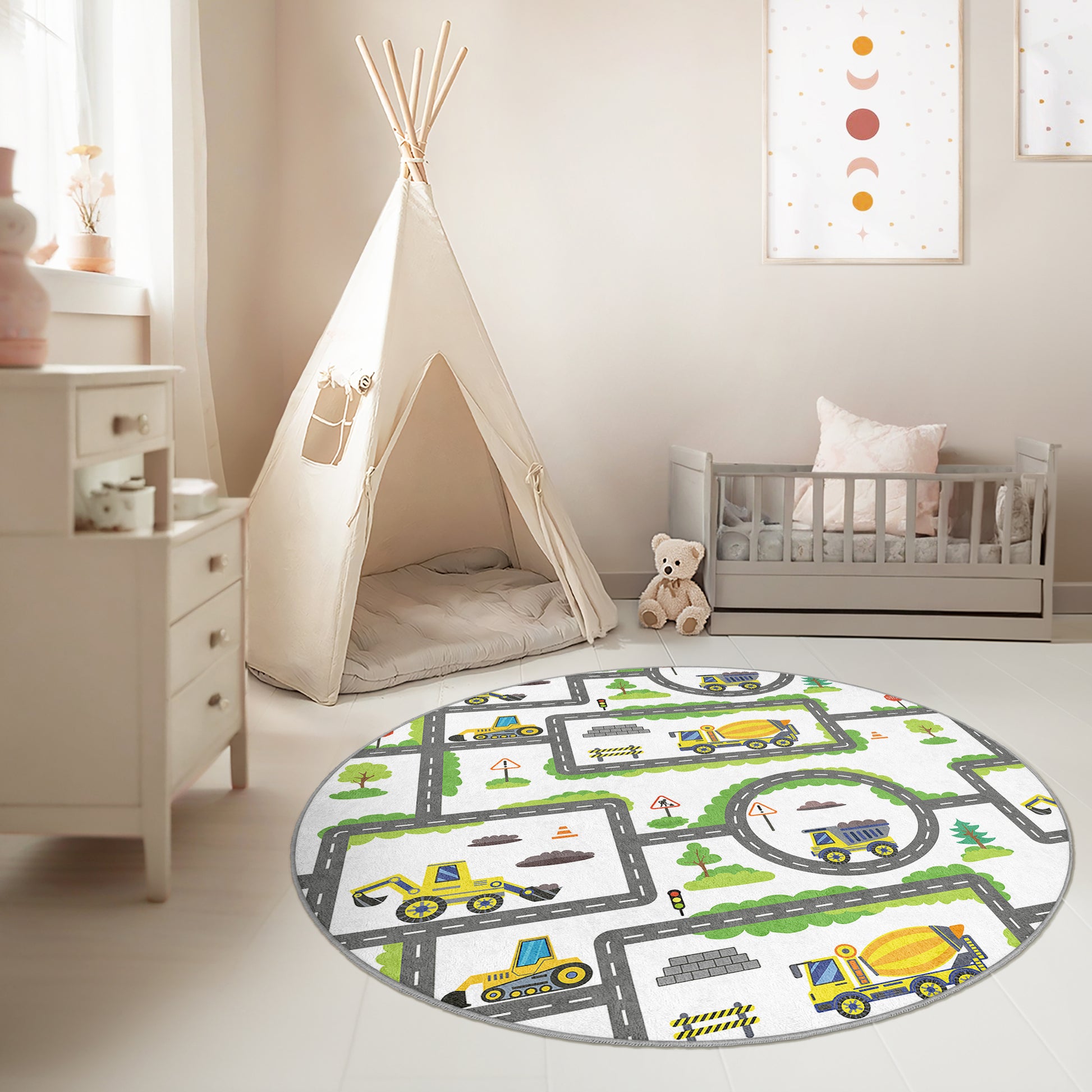 Construction Design for Boys Room Design Washable Anti-Slip Kids Round Rug Multifunction as Non Slip Play Mat - Perfect for Bedrooms, Playrooms & Nurseries - Durable, Safe, & Easy to Clean for Boys & Girls 324