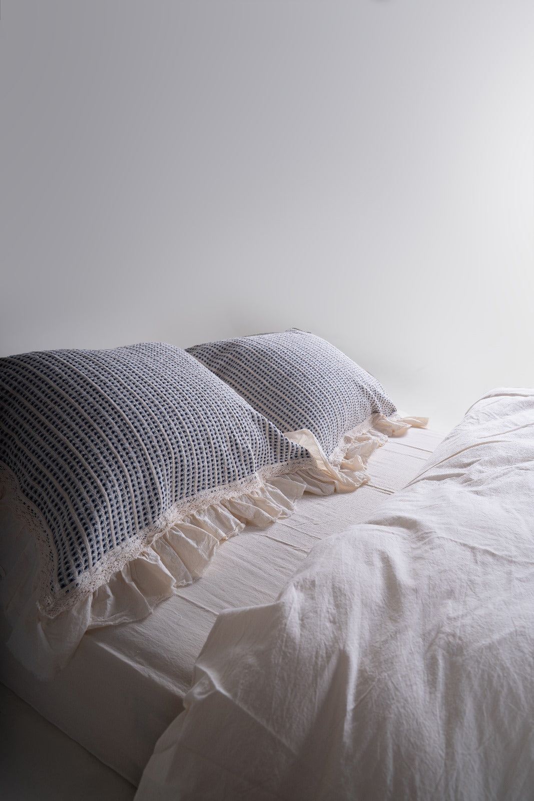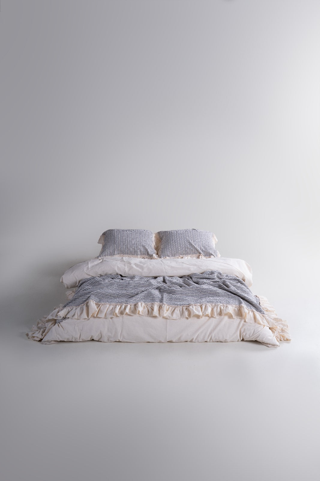 The Calm Ruffle Set is designed to transform your bedroom into a soft retreat, with its natural cotton texture and delicately gathered ruffle details. The gentle cream and blue tones are proven by environmental psychology (Ulrich, 1984; Kaplan, 1995) to reduce stress and evoke feelings of calm and comfort.