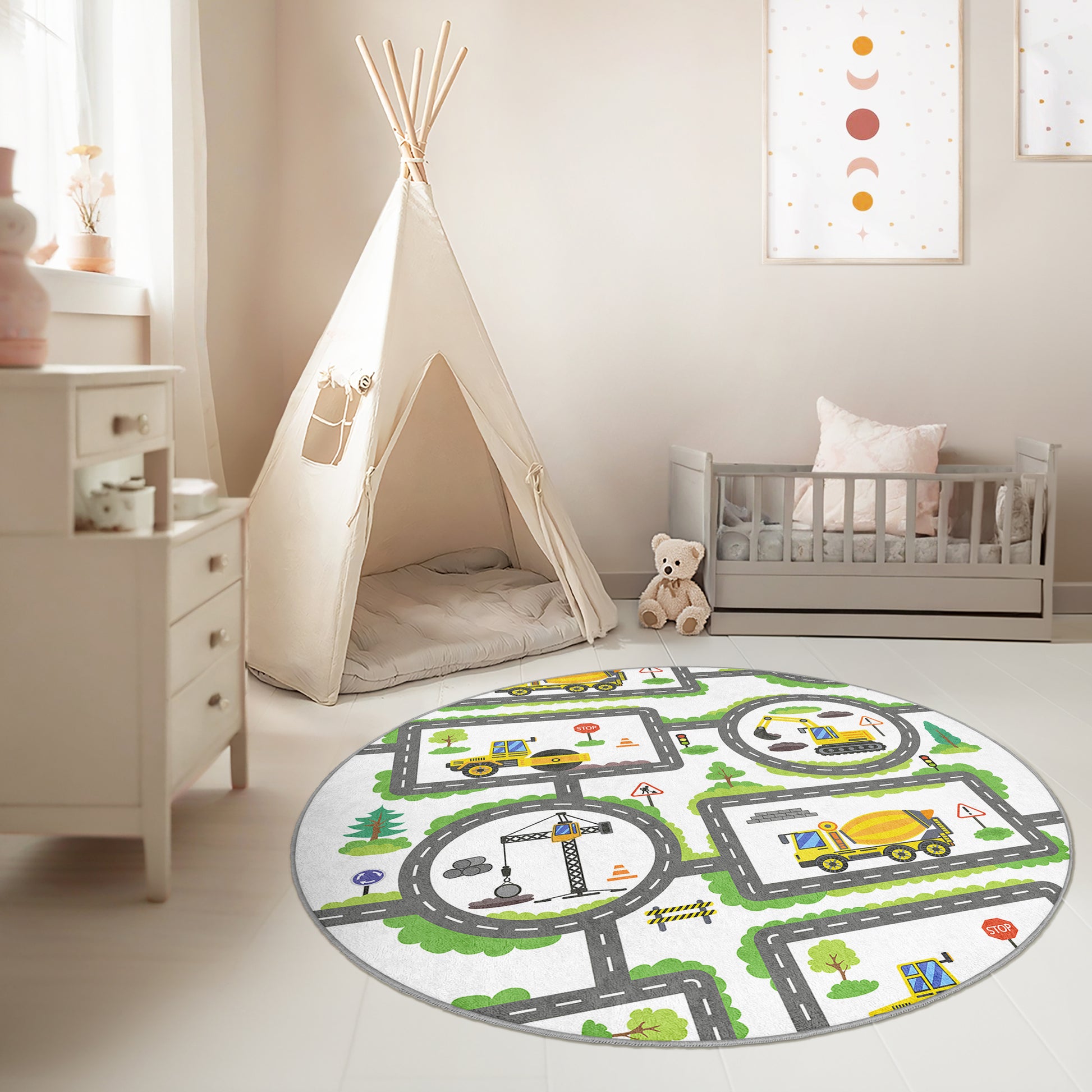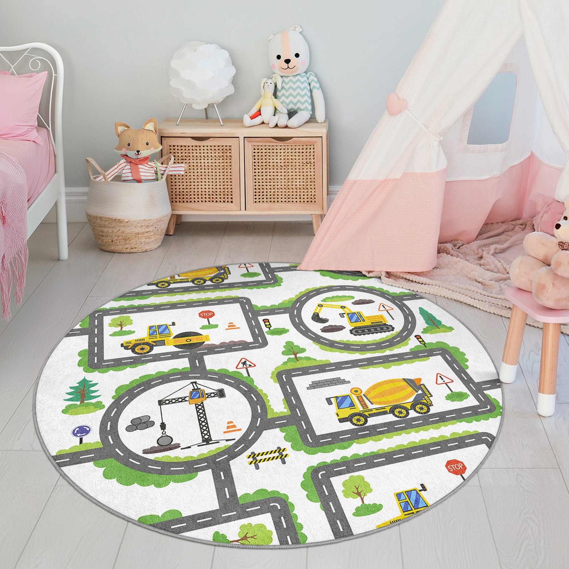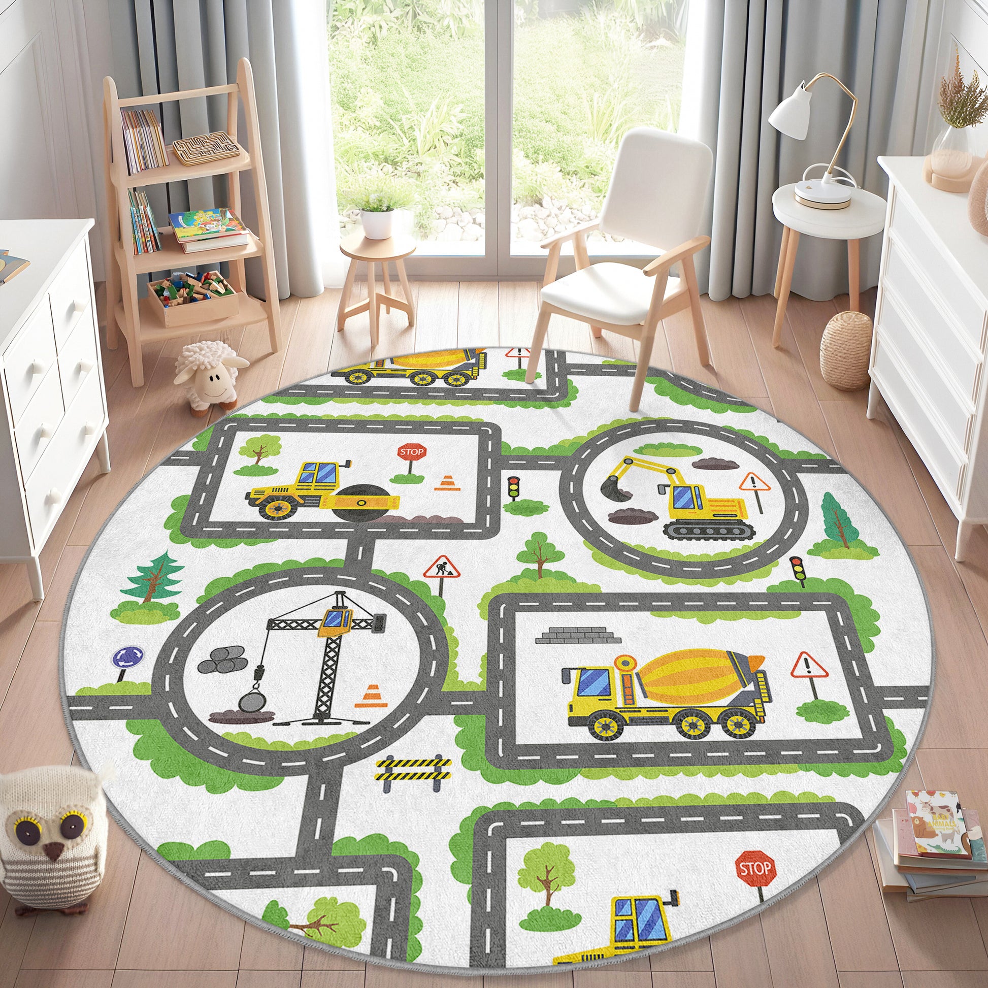 Construction Way for Boys Design Washable Anti-Slip Kids Round Rug Multifunction as Non Slip Play Mat - Perfect for Bedrooms, Playrooms & Nurseries - Durable, Safe, & Easy to Clean for Boys & Girls 322