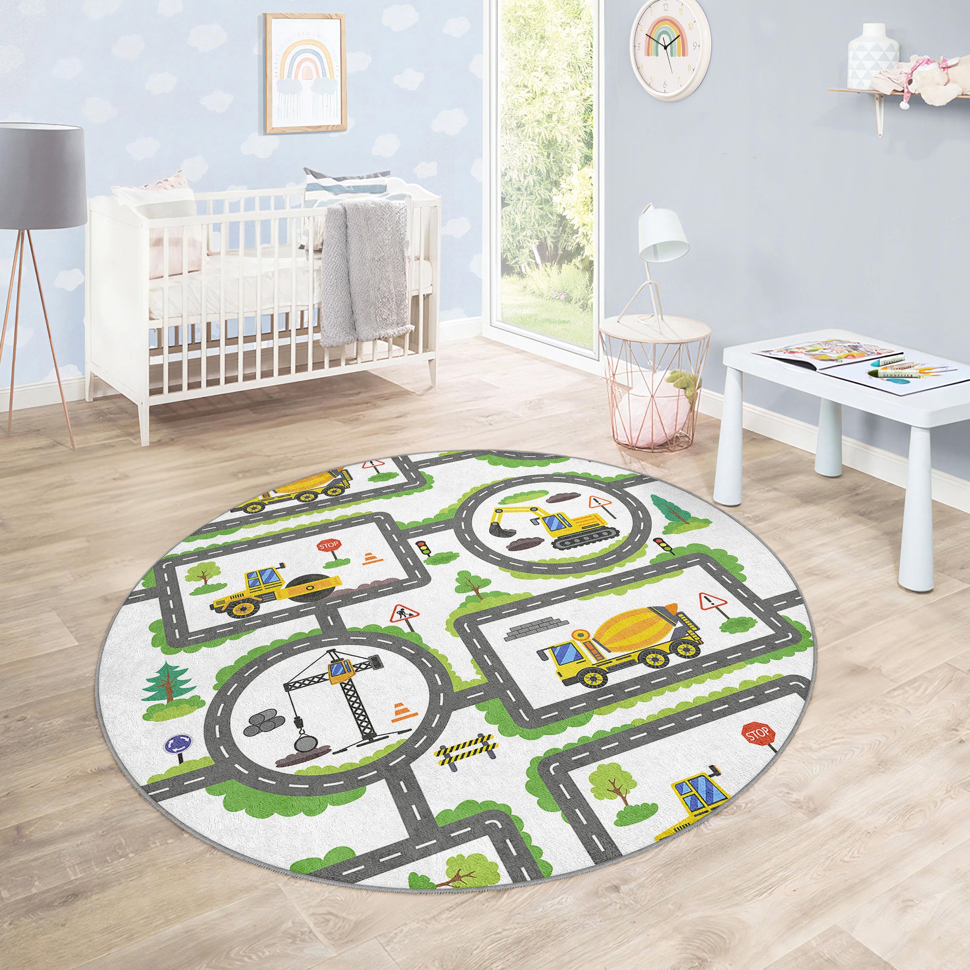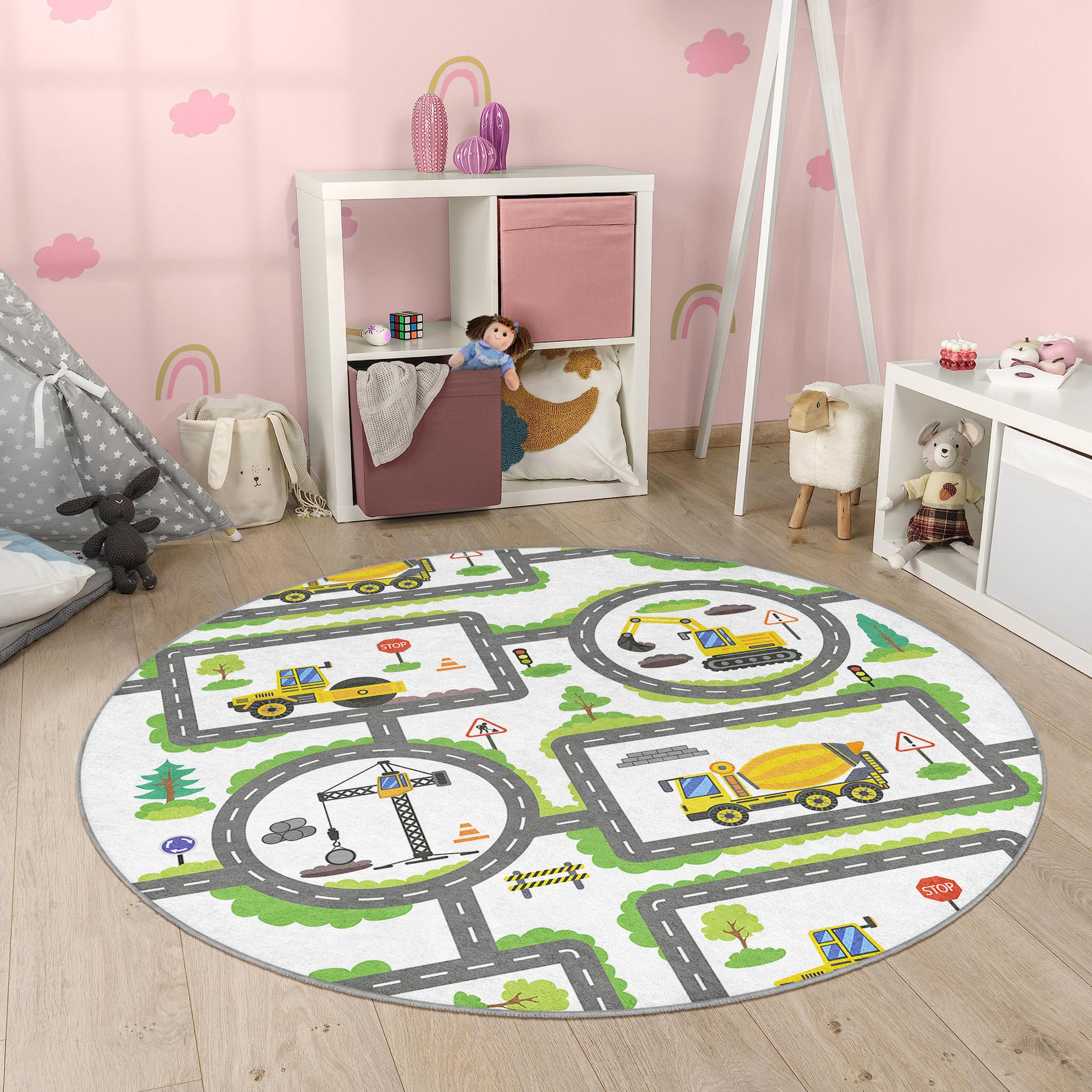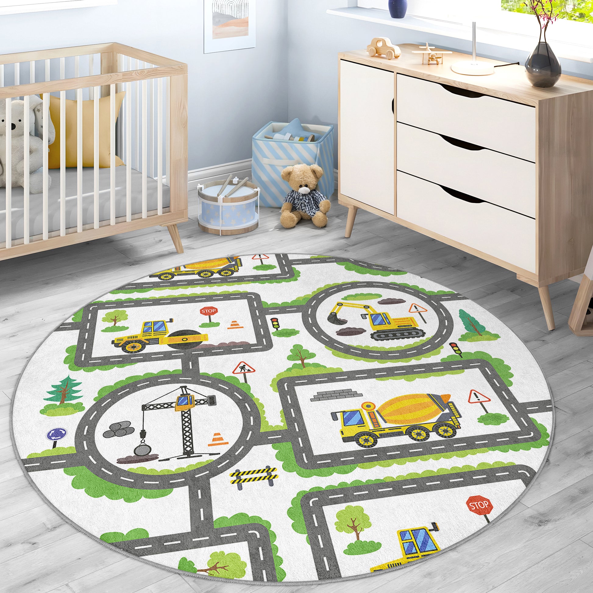 Construction Way for Boys Design Washable Anti-Slip Kids Round Rug Multifunction as Non Slip Play Mat - Perfect for Bedrooms, Playrooms & Nurseries - Durable, Safe, & Easy to Clean for Boys & Girls 322