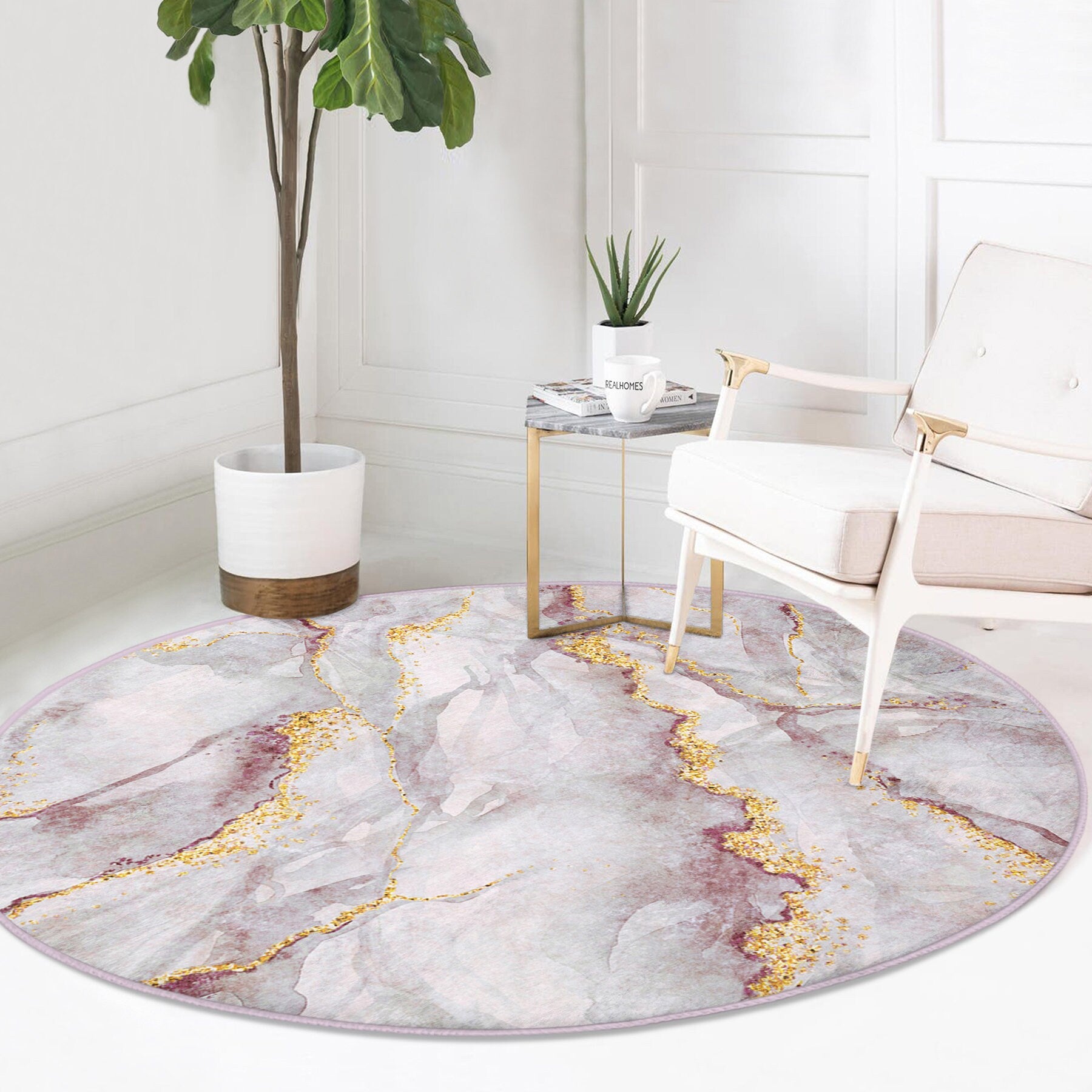 Round Gray Gold Rug, Minimal Marble Design, Non-Slip Base, Modern Pattern, Living Room, Bedroom Decor, Abstract Rug, Carpet for Home Garden