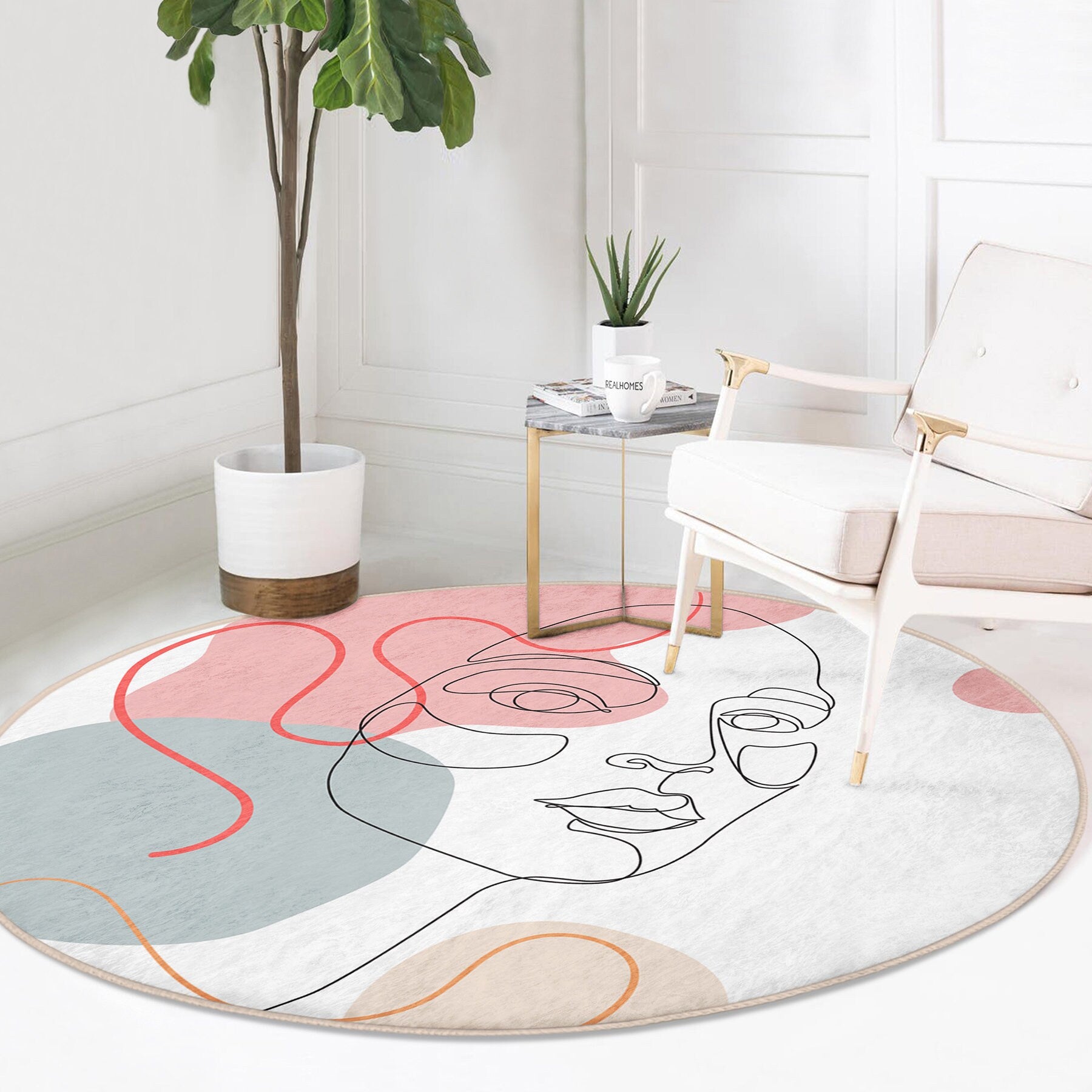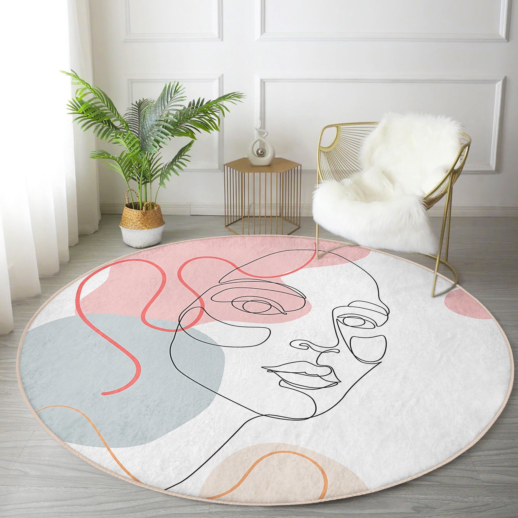 Round Pink Drawing Rug, Minimal Abstract Design, Non-Slip Base, Drawing Pattern - Living Room, Bedroom Draw Art, Rug, Carpet for Home